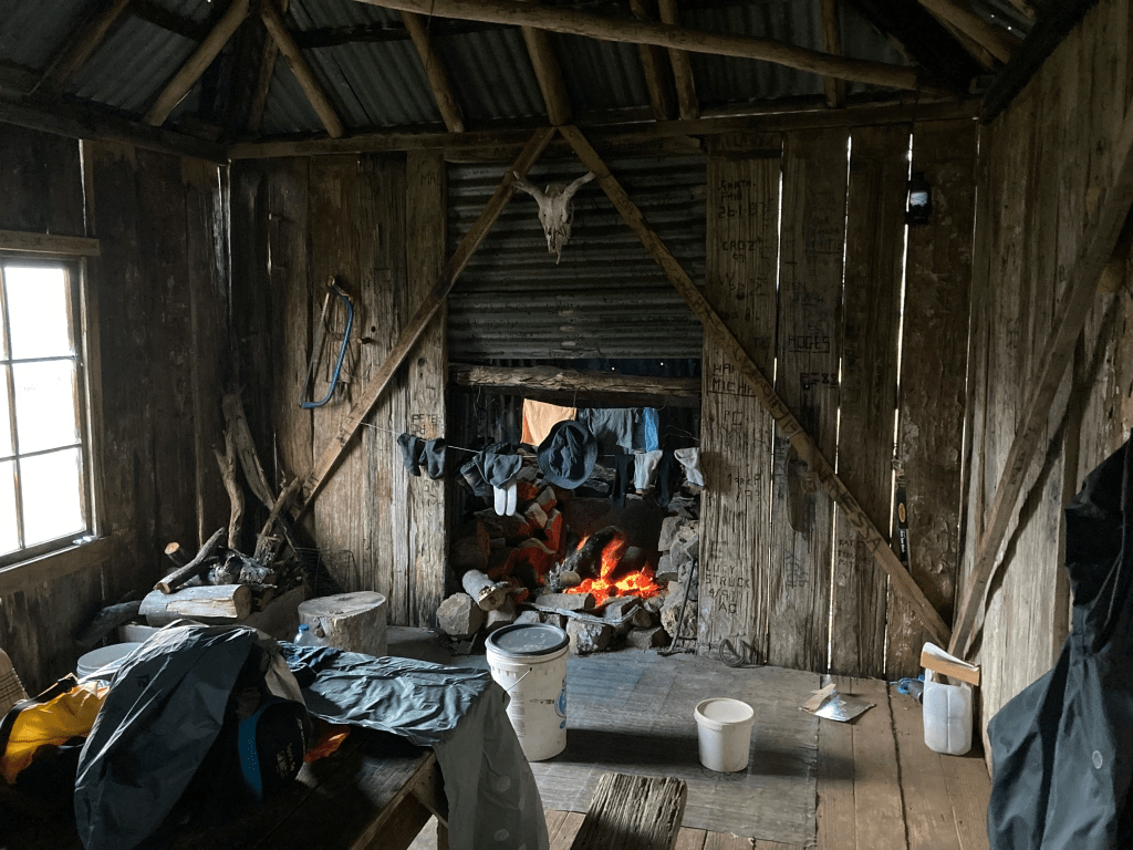 Another day of horrible weather followed by trying to dry out by a fire. Witzes hut is another charmingly rustic old hut. The 1952 structure is built partly using materials from an older hut that stood on the site, itself built in 1882. The walls are made of vertical adzed slabs and over a hundred years old.