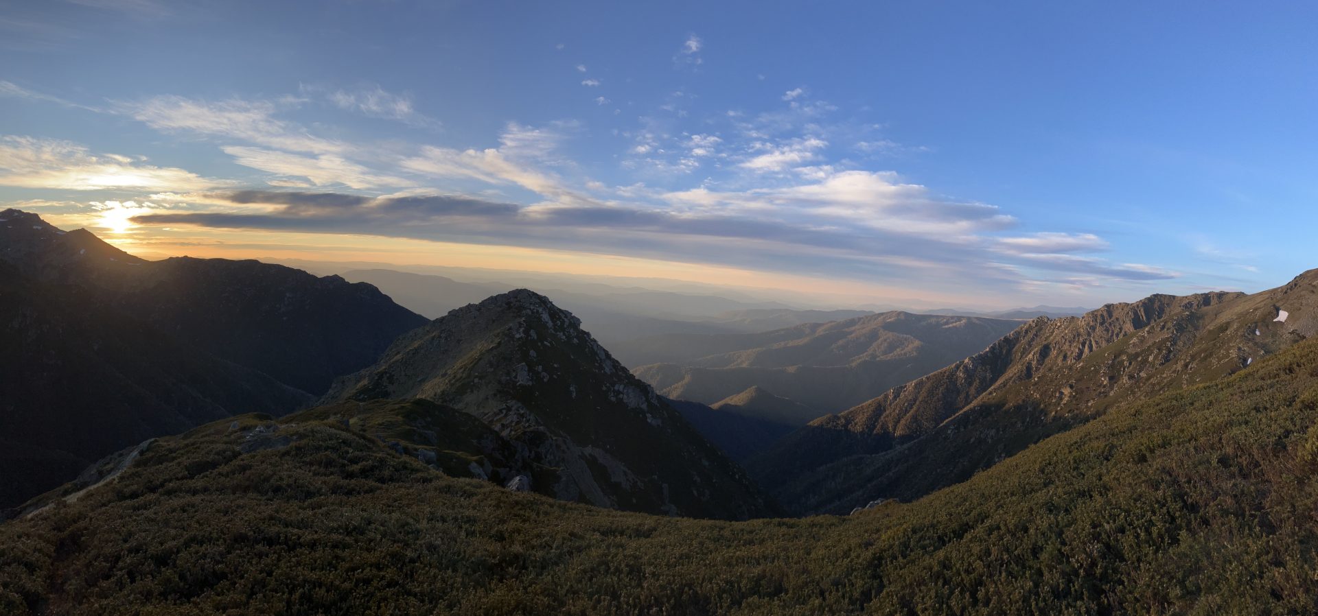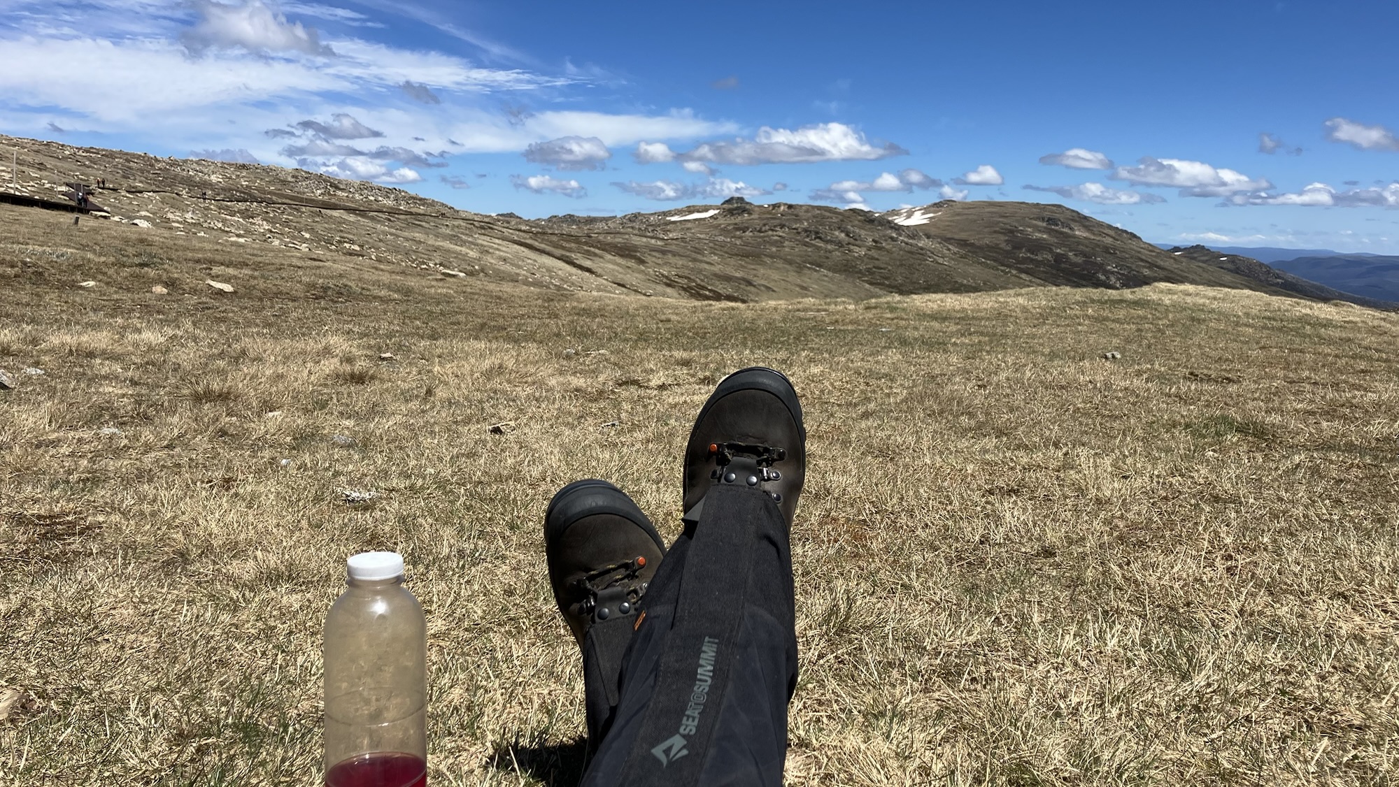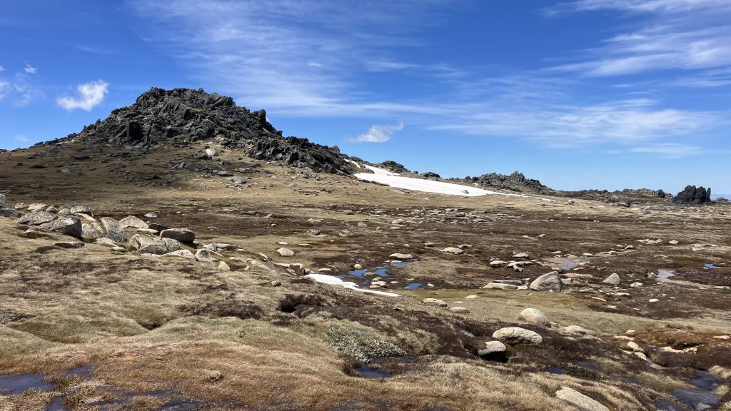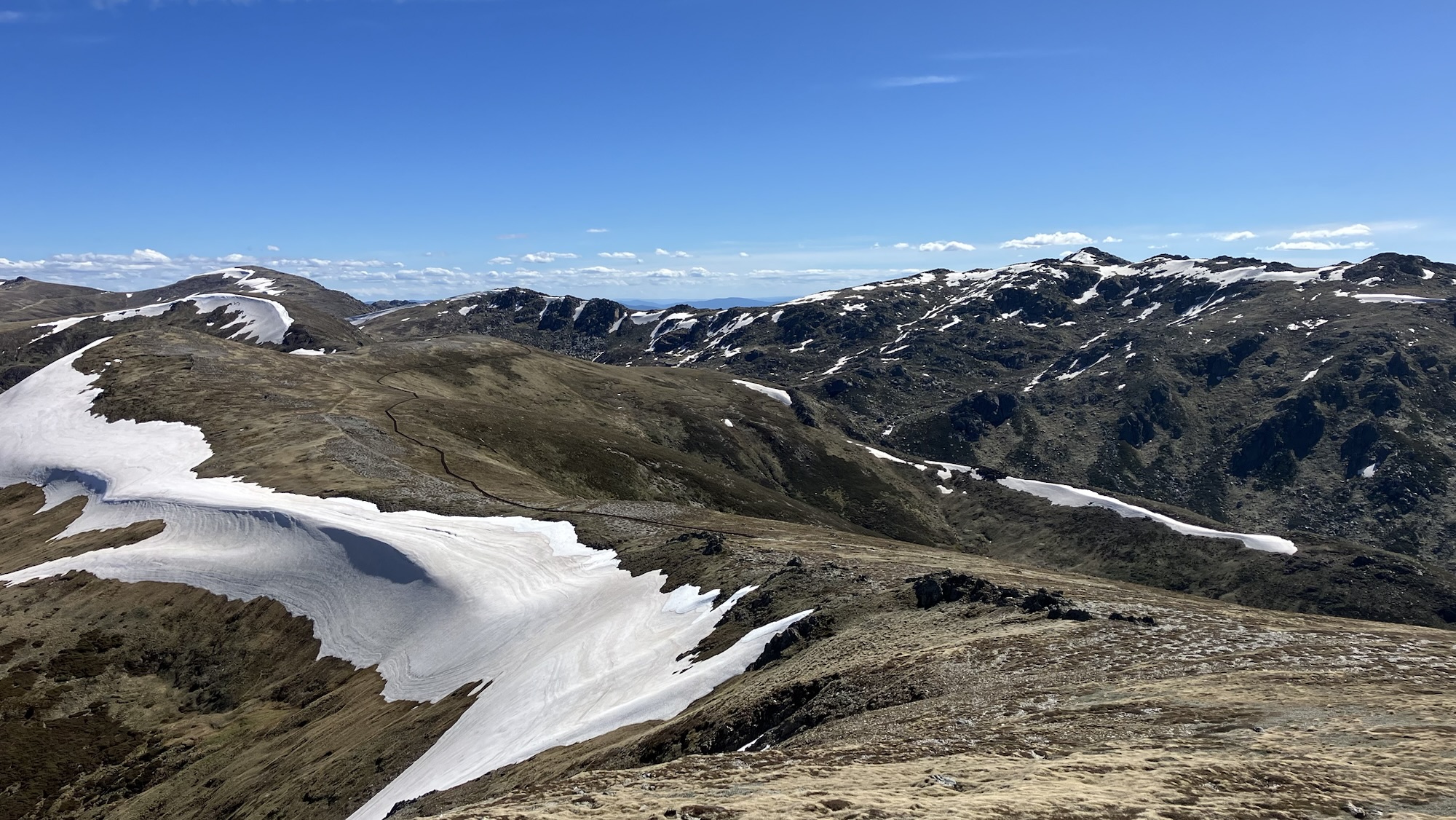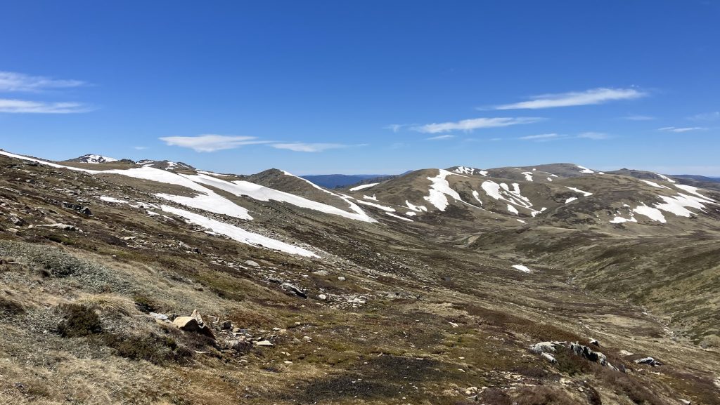 Steven left us (and presumably made it back to his car okay) and we continued along the Rams Heads. There’s something vaguely New Zealandish about this section, which I haven’t walked before. Eventually we dropped down onto the metal boardwalk that runs from the top of the chairlift to Mount Kosciusko, and shared it with the many people out for a day walk. There’s a very decent amount of snow up here for this time of year.