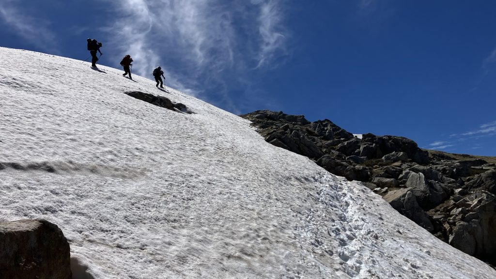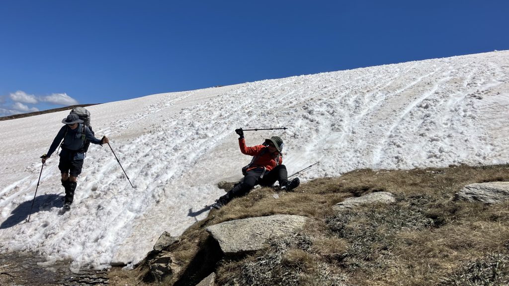 We pretty quickly hit drifts of snow. I’ve spent the last fortnight worrying over the forecast, and last Monday saw eighteen centimetres of fresh snow fall up here on the first day of summer. It’s been a heavy year for snow. But luckily that fresh stuff all melted quickly and the day is sunny and, if not warm, then at least pleasant.