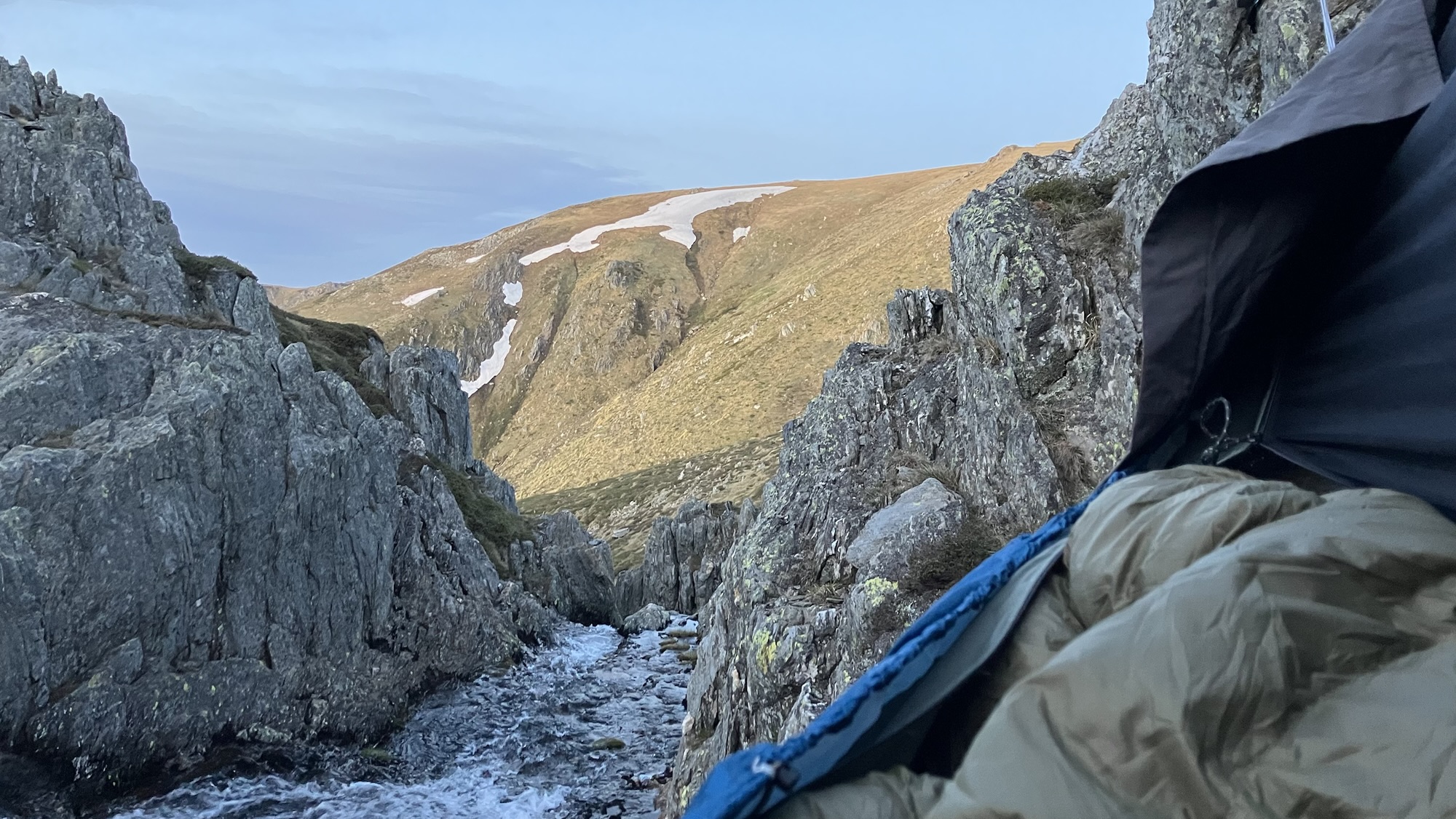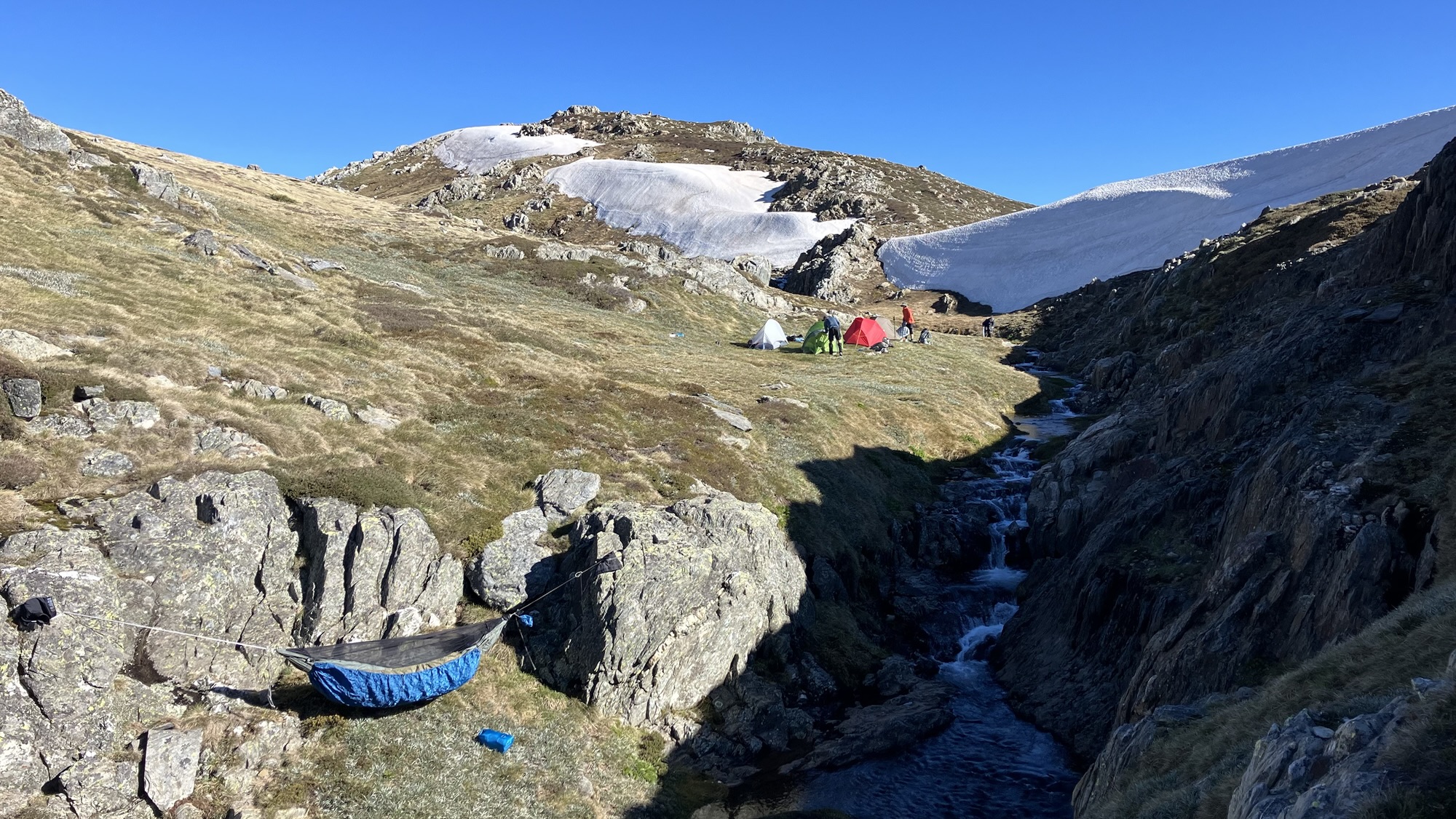 Our campsite for the night is in a little valley east of The Sentinel, sheltered from the prevailing winds. Last time I was here I strung my hammock across the creek, but with it now swollen with snow melt, I decided to find a safer spot.