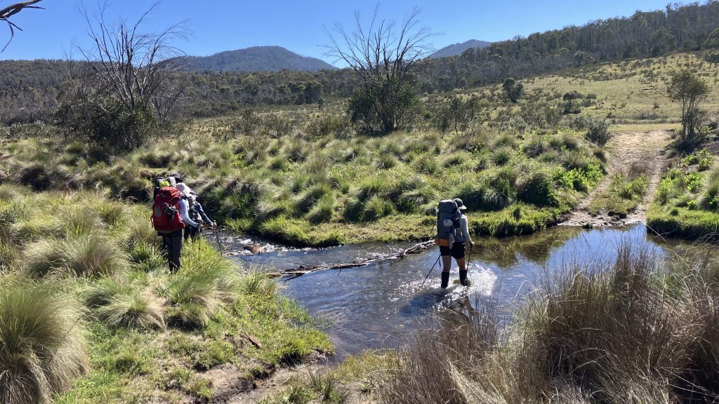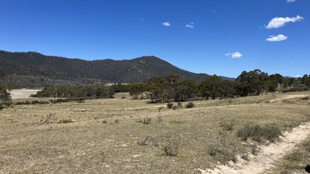 Back in the ACT we descend along a track that frequently crosses boggy ground east of the saddle. Down to Cotter Flat. Somebody has built a pair of small rock weirs that are doing a good job of raising the level of the crossing.