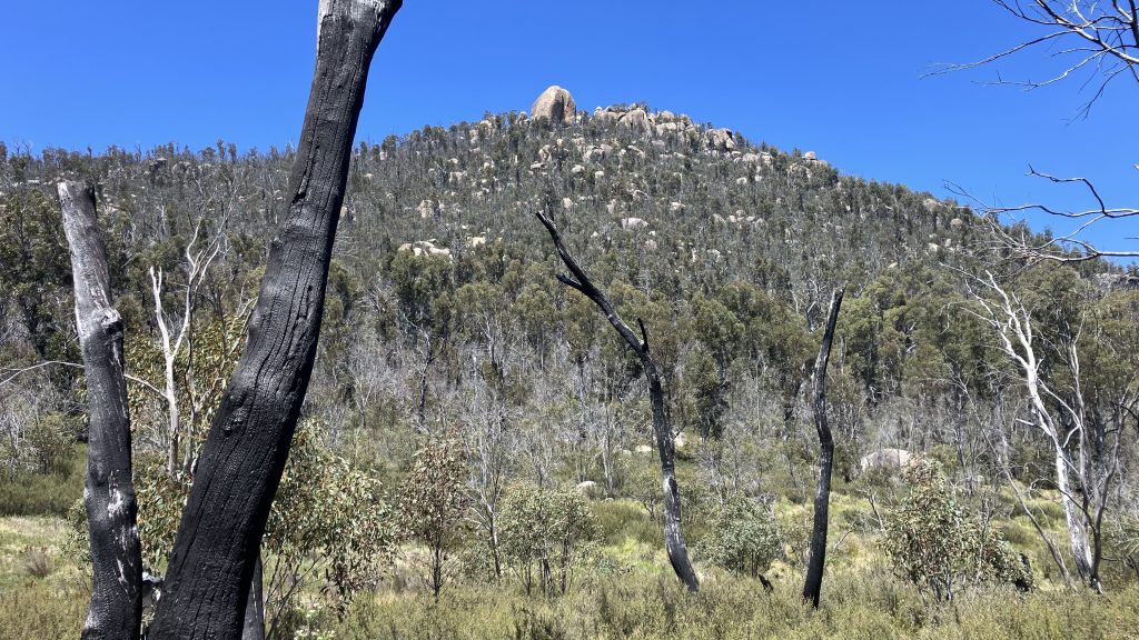 From Cotter Flat the track rises towards Cotter Gap, gently at first, then annoyingly steeply. The scrub to either side tells a story of fire not so long ago, and we talk about where we each were during the various fires that have threatened Canberra.