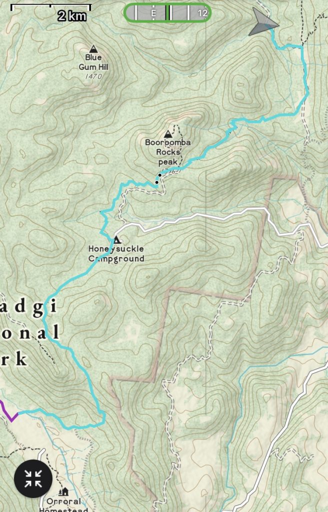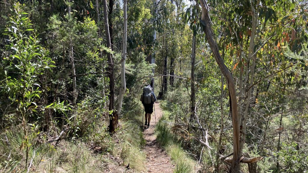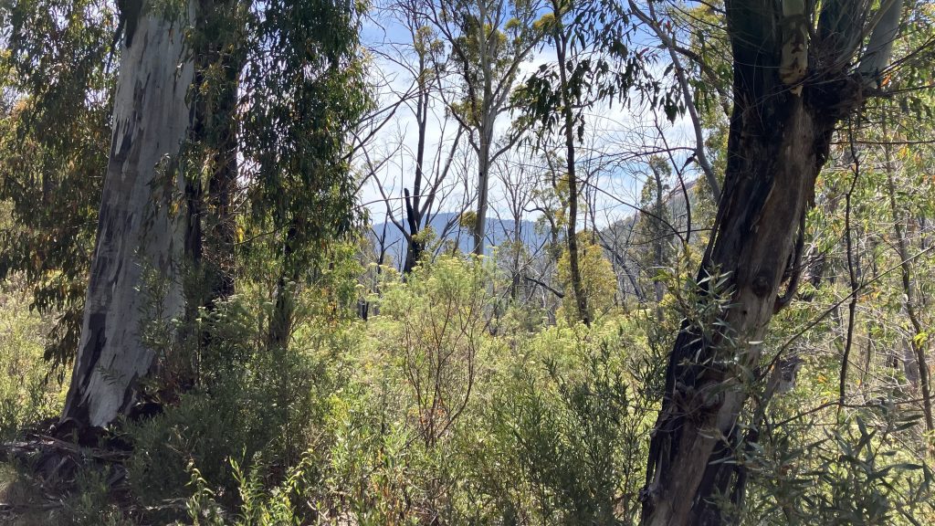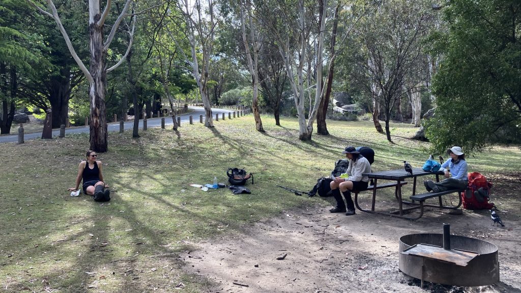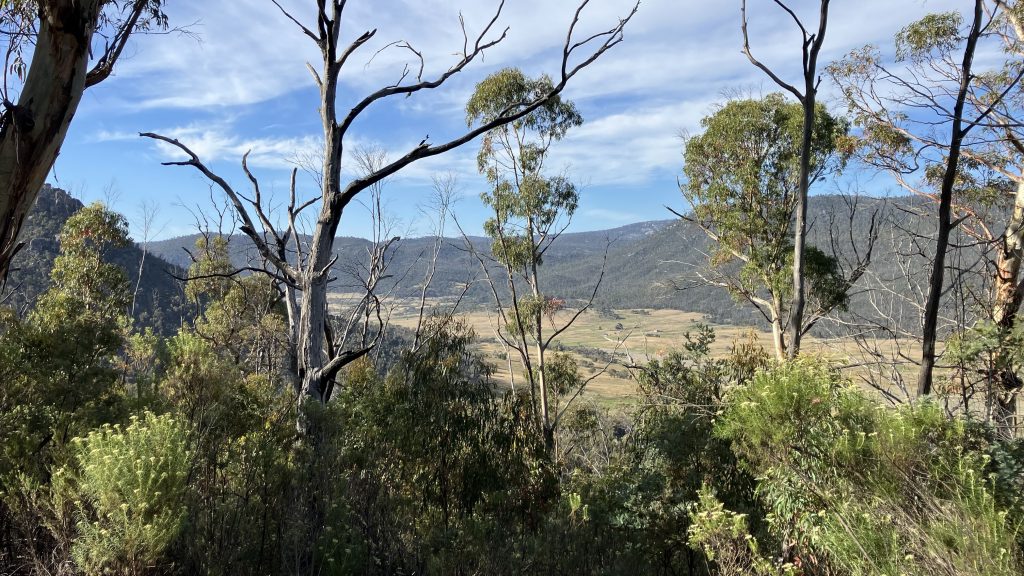 It’s the climb that keeps on giving. But eventually we start down the long downhill to Honeysuckle Creek campground. It’s a really pleasant site, and the firies must have pulled out all the stops to protect it from burning in 2019/20. The day is warming up, but the trees provide lovely shade.