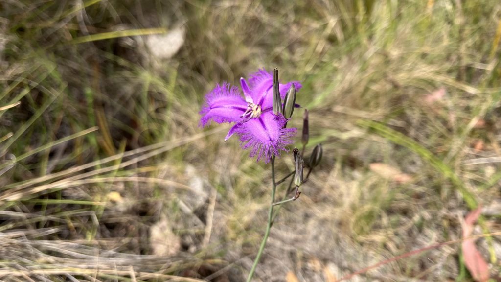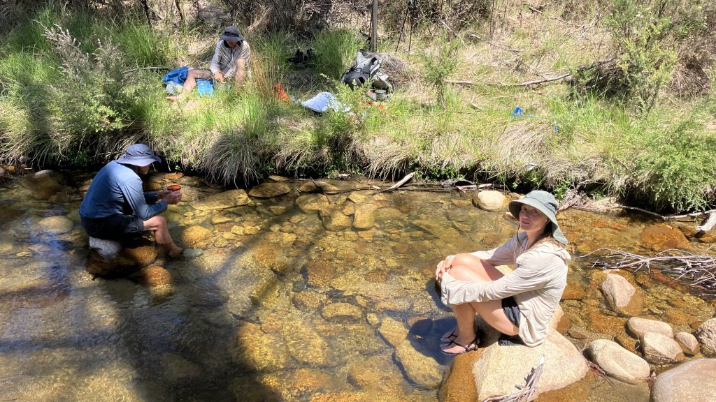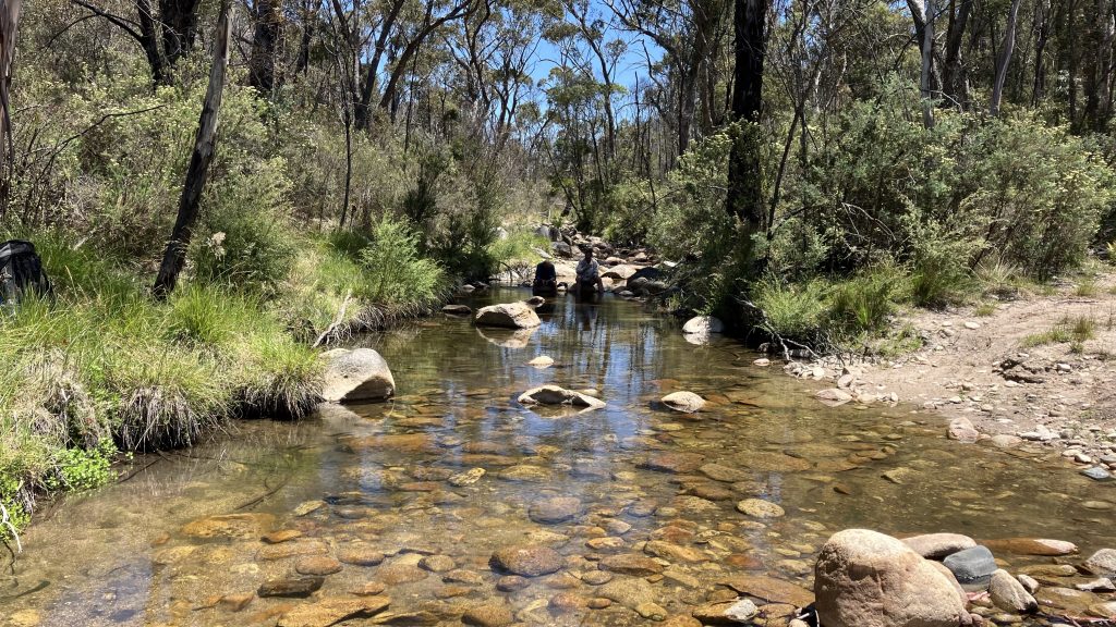 As Robyn disappears up the trail, the rest of us start down towards the valley beneath Blue Gum Hill. We walk slowly to conserve fluids in the bartering heat. There’s a creek 600m down that, when planning, I had hoped would provide, but unsurprisingly, it’s bone dry. We continue another kilometre towards Blue Gum creek. We’re all carrying the worry of what to do if that’s dry too. Thankfully, when we finally make it down to the creek it’s flowing strong and clear.