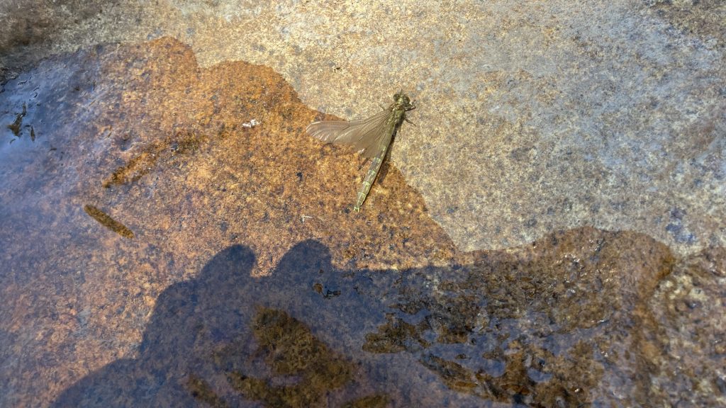 There aren’t a lot of good tent sites here, so we spread out to find them. Then we spend the afternoon sitting on rocks in the shade with our feet in the stream. The trees are full of cicadas, slowly chirping their song of laziness. There are fish in the stream, and at one point a 30cm rainbow trout swims up to us before somebody moves and it dashes away. Birds dash in and out of the water, bathing. A flock of black cockatoos play in the trees nearby. A small snake (I’m fairly sure it’s a juvenile red belly black) swims nearby. Later, an adult makes its way stealthily down the bank, stopping to poke its head into every crevice in search of frogs. We shadow it carefully from a respectful distance until it’s gone beyond our camp. We watch a dragonfly nymph emerge onto a rock and spend half an hour spreading and drying its wings before taking flight for the first time. It’s a magical spot to spend our last afternoon of the walk.