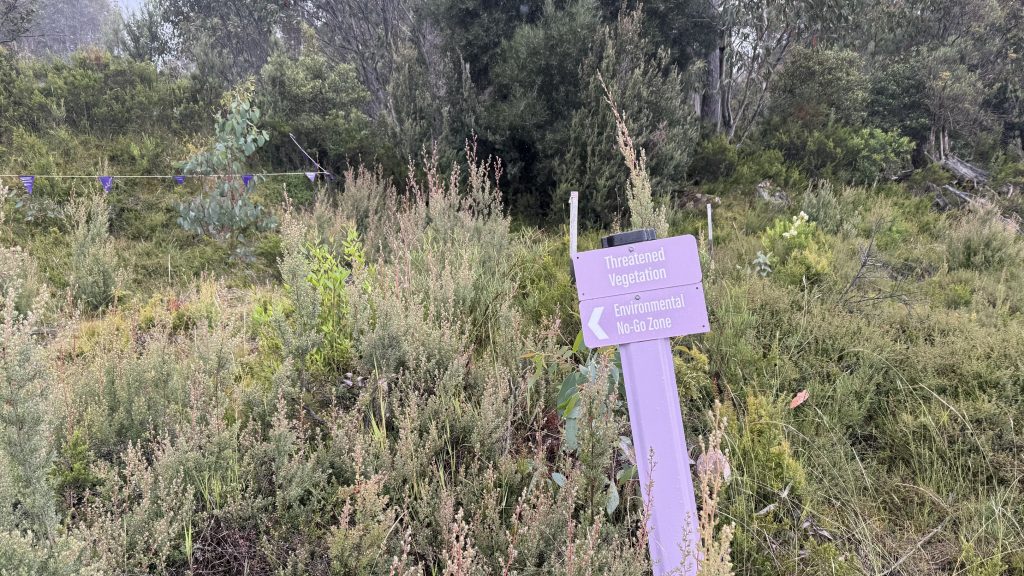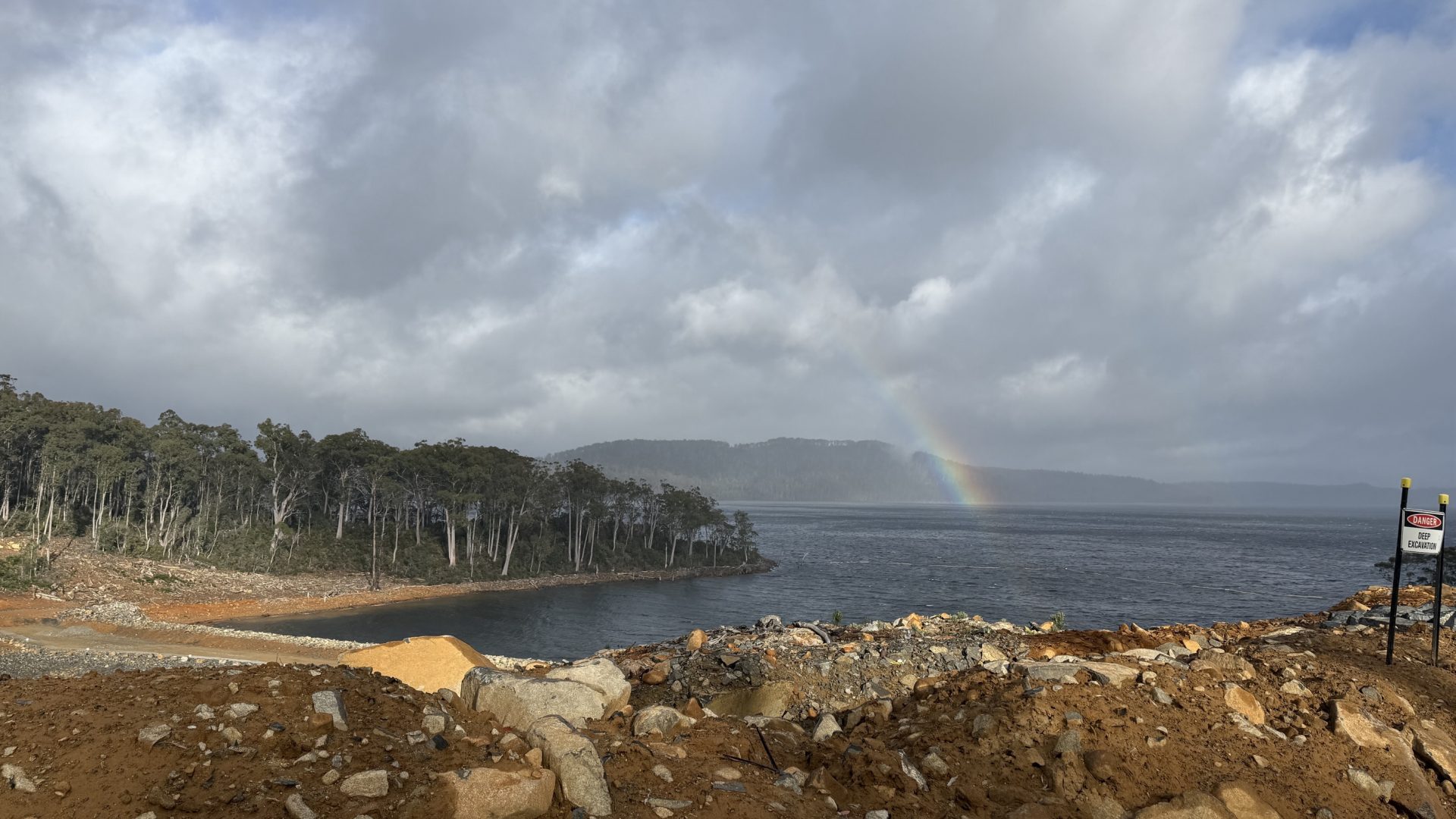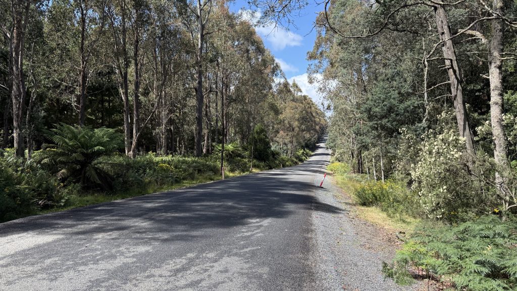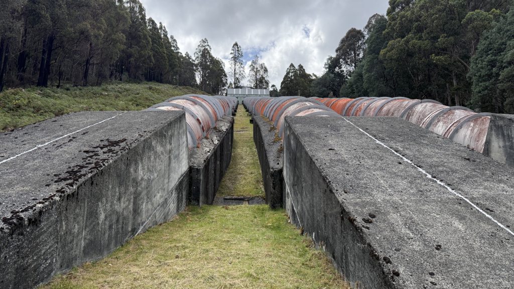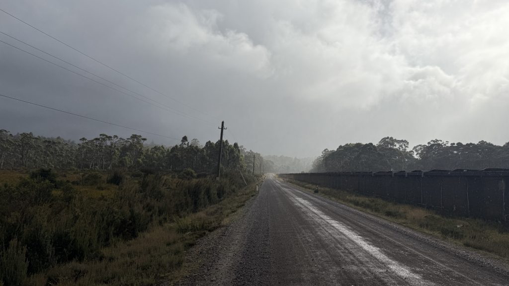 Around the bend, a couple of Hydro workers are sitting in utes out of the rain. I ask them, and they say it’s fine to walk through, just watch out for trucks.