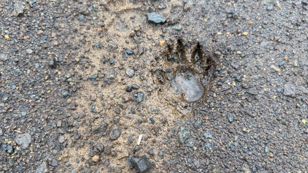 In places I realise I can jump ten meters to the right and walk on a somewhat cleared forestry path. This is a nice reprieve from the constant vigilance of walking on the road. An oncoming gust of wind sounds almost exactly like an oncoming car. Mostly the wider shoulder is on the right. Mostly I walk on the right so I have a clear view of oncoming traffic. My life is watching and listening for cars.