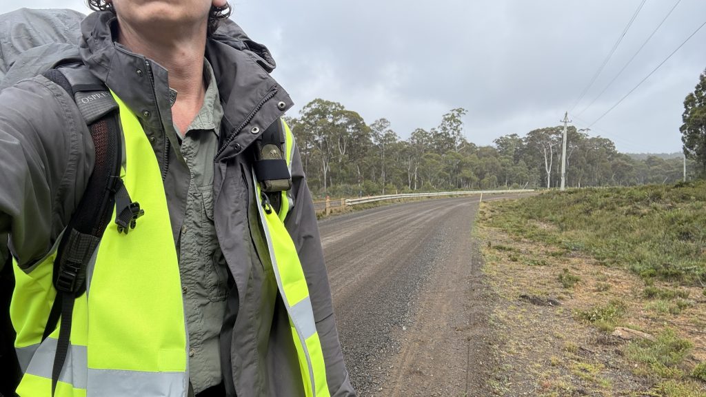 One of the many utes driving past stops for a chat. He’s happy for me to be walking through, but he’s worried about my grey attire in the drizzle and cloud. He gives me a high vis vest to wear and wishes me luck.