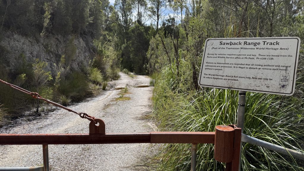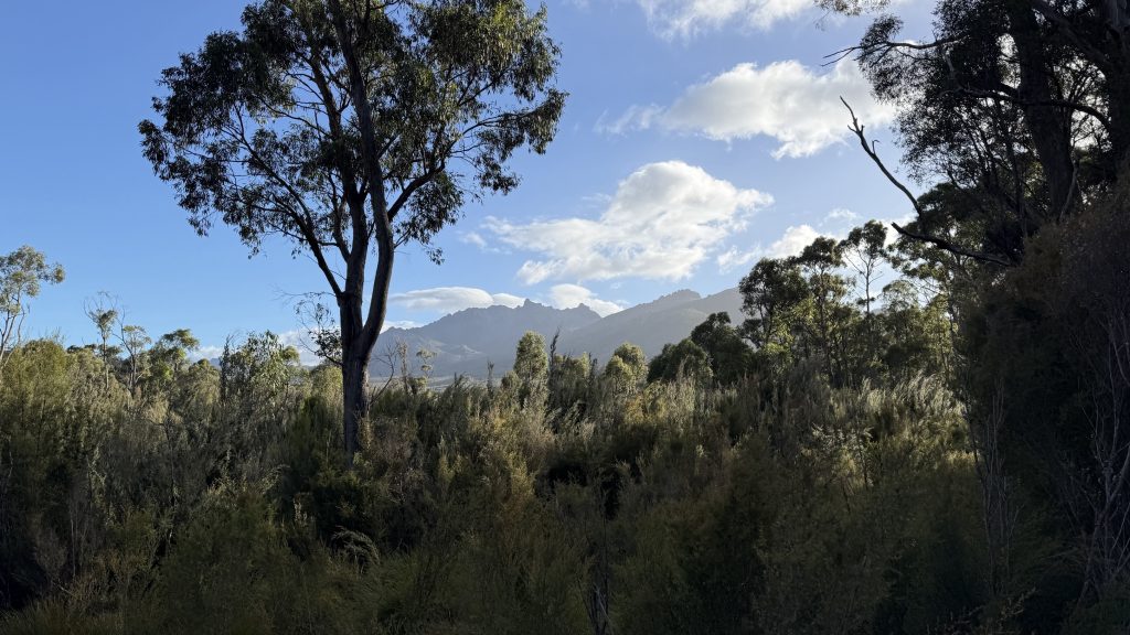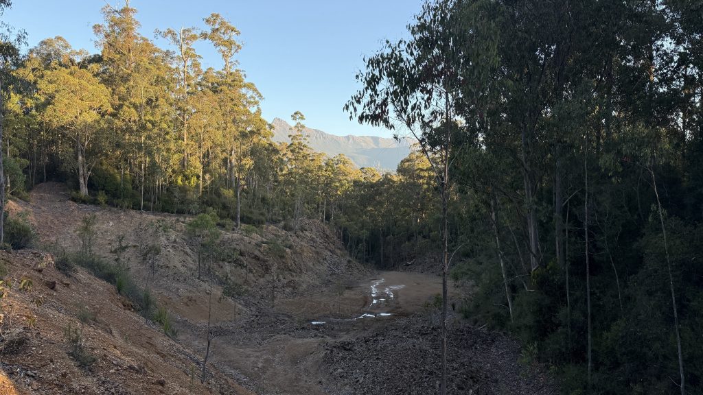 Walking out of Adamsfield in the morning light, the telltale mining ghost town signs are visible; old cuts and earthworks in the leaf-littered soil. Some where buildings were, others likely mining claims. The air is fragrant with yesterday’s rain on the vegetation.