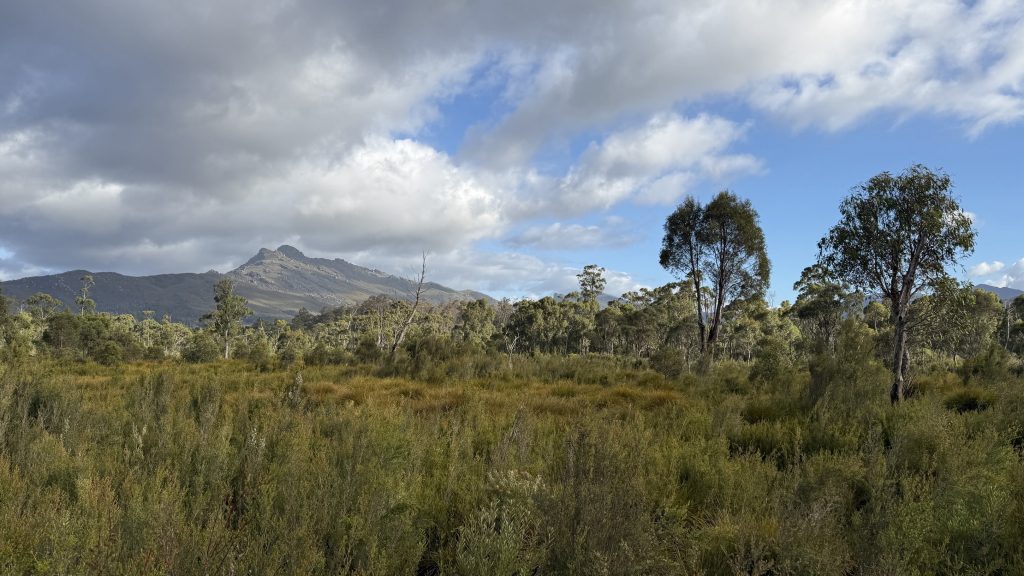 I consider pushing through the extra ten kilometres to Condominium Creek campground at the start of the Mount Anne circuit. It would be a 37km day. I’ve got the legs for it, but not quite the daylight. I make a turn at a spot I’d noticed on the map last night. Woody Island. The satellite imagery showed a bare area ringed by trees. It turns out to be an old quarry site. I guess that explains the name of the watercourse that runs past it; Gelignite Ck. It makes for a nice campsite off the main road, once I carefully sidle the large mosquito infested pool blocking the entrance.