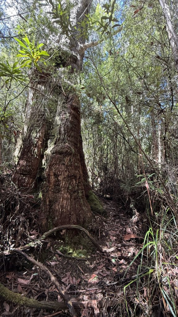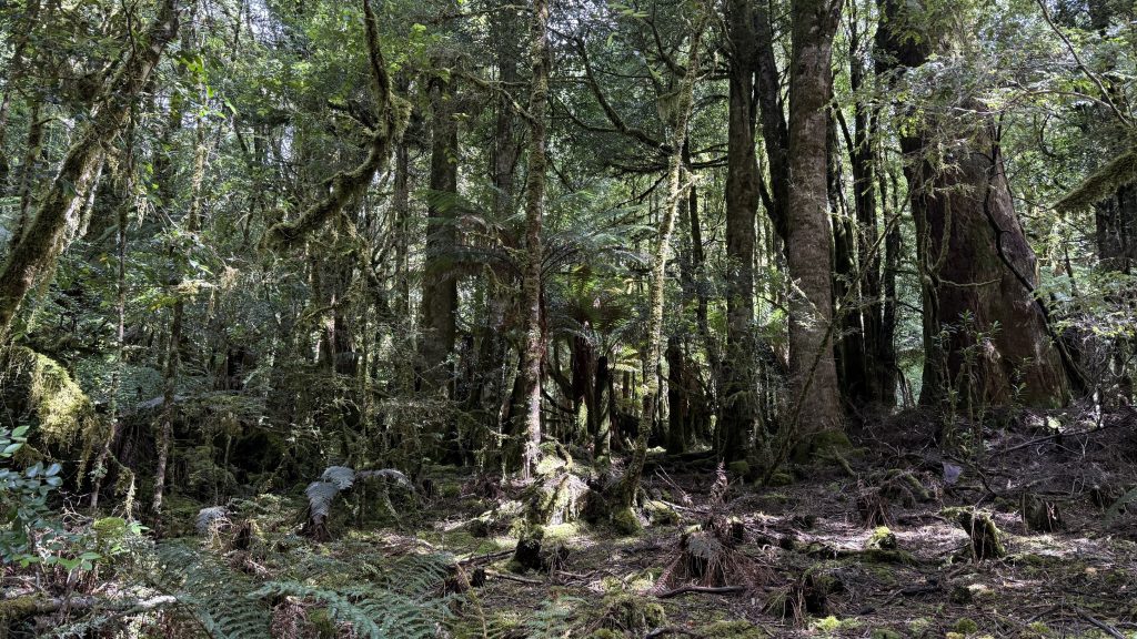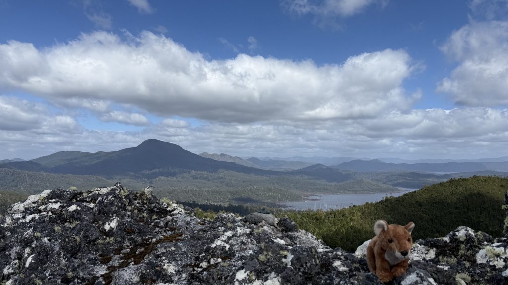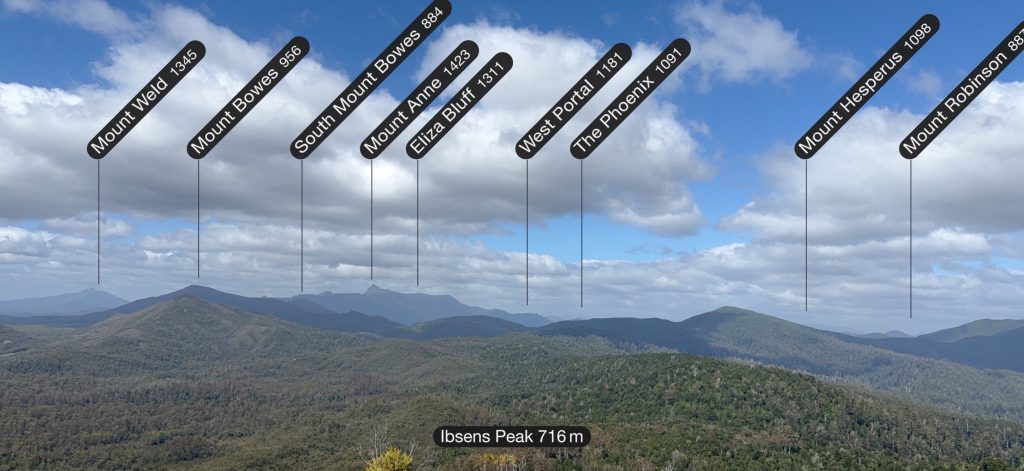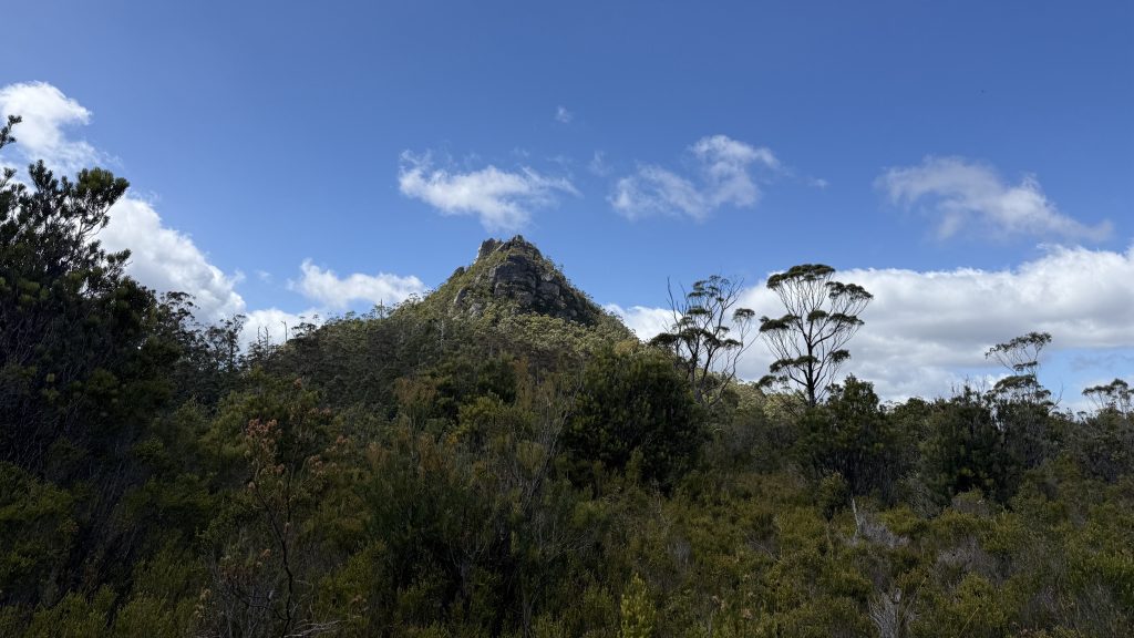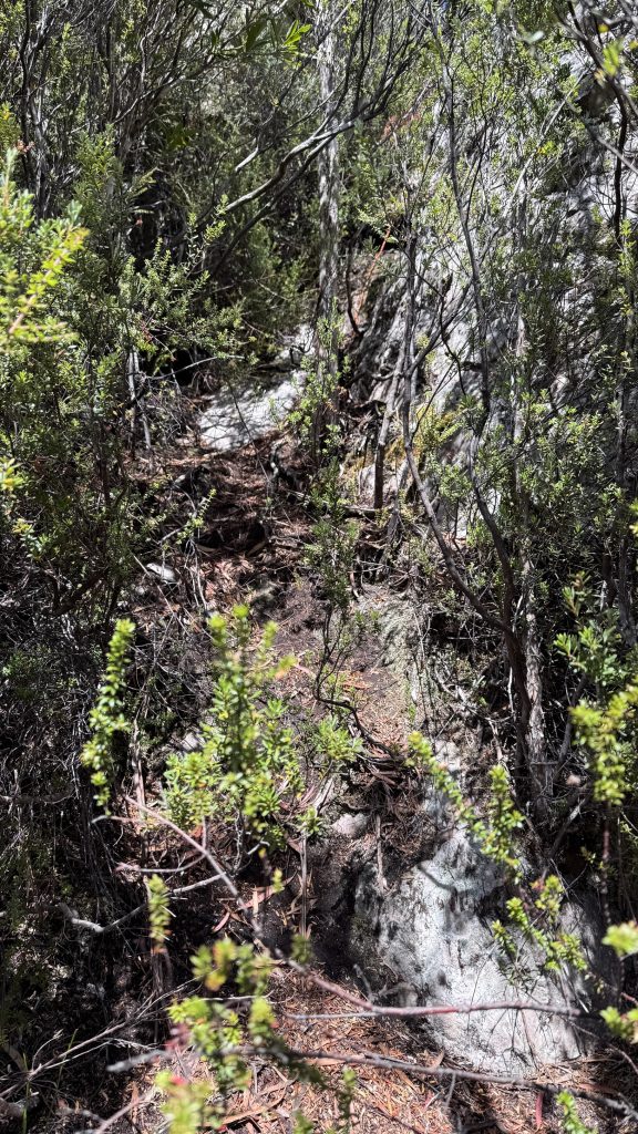 I decide to attempt a side trip to climb Ibsen’s peak. A small cairn marks the start of the track, which is flagged and mostly distinct, if only because it’s the only route through the encroaching and impenetrable scrub. Some places it widens, others it closes in and I’m swimming in damp brush. I can’t help but wonder what strange alloy the men and women who blazed these trails were forged of.