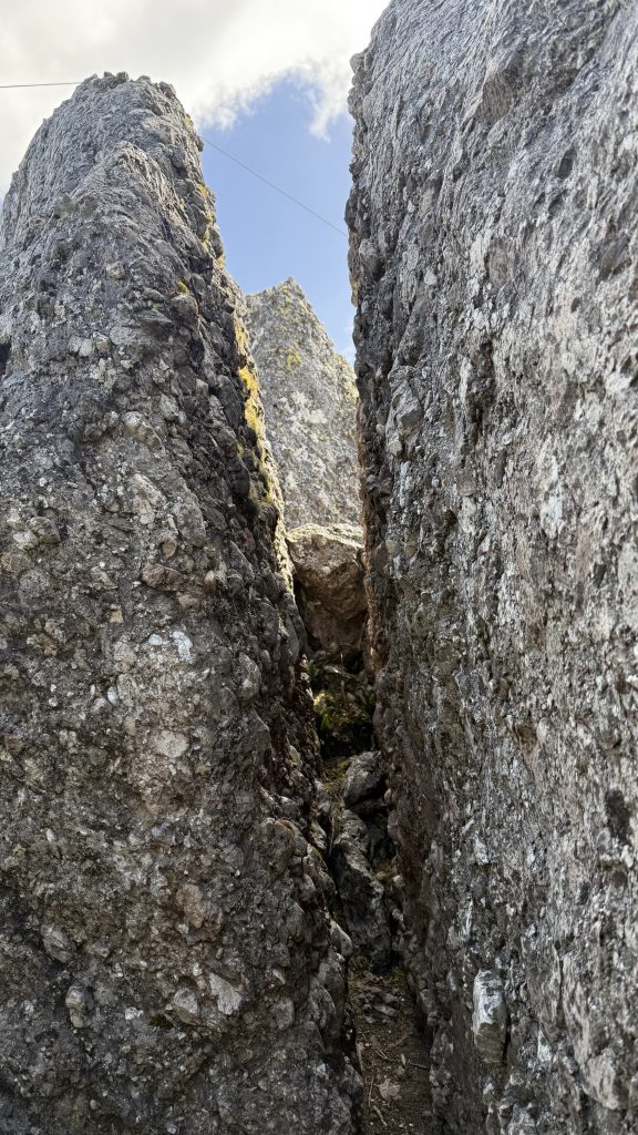 The trail steepens into a climb, though still in scrub. You know you’re doing something interesting when there’s a fixed rope in place.