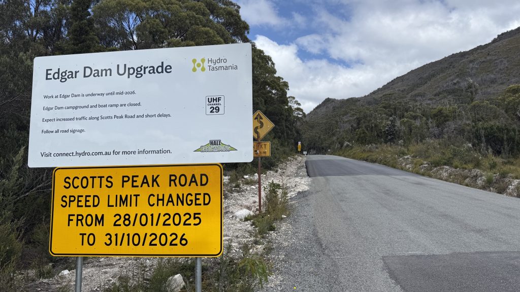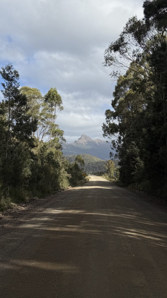 Other than the two truck-and-dogs that speed past in a cloud of dust, first in one direction, then half an hour later in the other, Scotts Peak road is quite a pleasant walk, lined on both sides by dense forest, occasionally parting to reveal a glimpse of Mt Anne. Streams burble in small waterfalls by the roadside, wreathed in ferns.