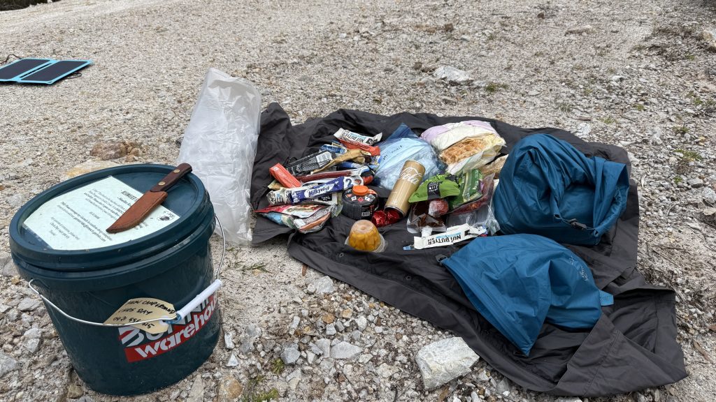 When I reach the place where my food drop is hidden, it’s location isn’t immediately obvious. But turning airplane mode off and using the Find My app on my phone, I’m quickly able to home in on it in the scrub. I don’t even have to take a step off the road to reach it, but it’s invisible. Well done, Rohan from TWE.