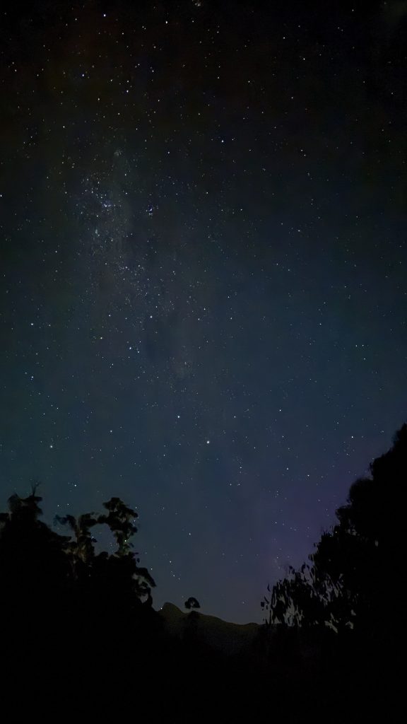 Robyn messages me later with a possible aurora alert. I climb the wall of the quarry in the dark. There’s the faintest smudge of colour on the horizon. The stars are magnificent.