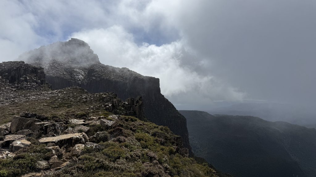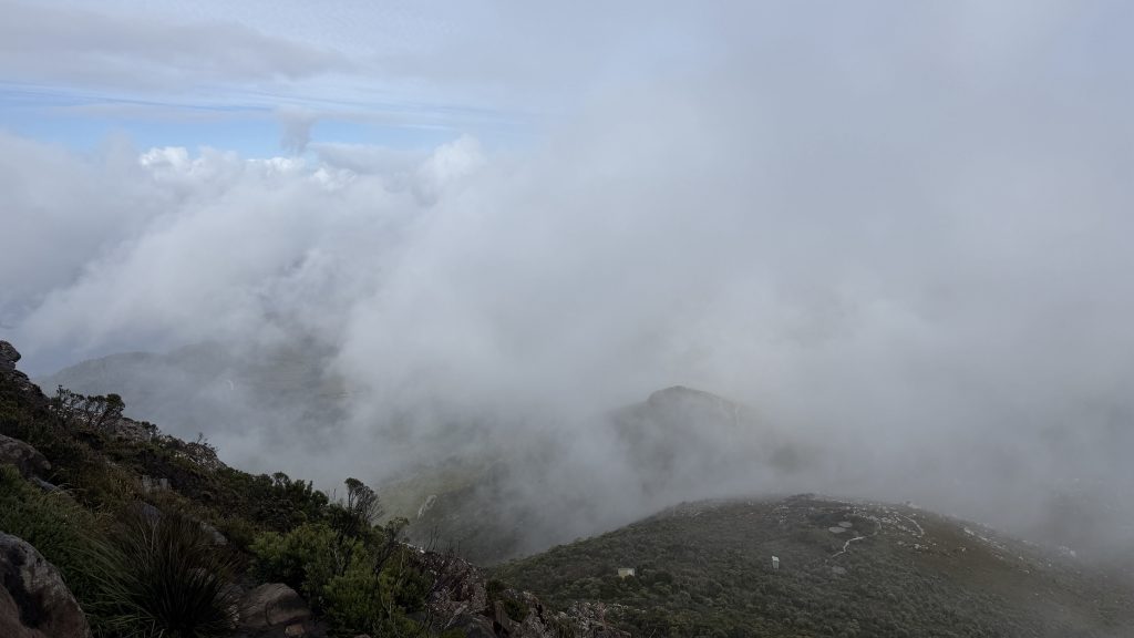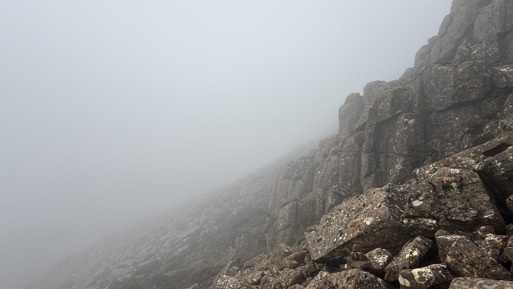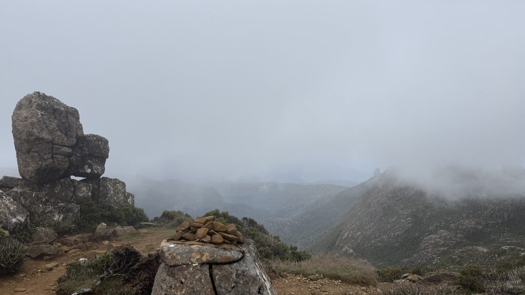 I climb carefully and determinedly up the marked dolerite boulder field to the summit of Mt Eliza. Tantalising gaps form in the clouds then close again.