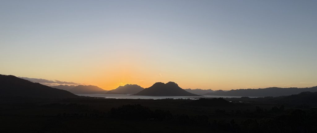 While I’m eating, a camper van pulls into the parking lot. Mia and Roux have driven to Tassie from Perth and are on a hiking adventure of their own, travelling around and going to cool spots. They were just at Lake Rhona back around when I had all that rain at Adamsfield. Apparently people were crossing the log with it under several feet of water! But there’s a better log 100m upstream, bigger and higher above the water. They’ve also done Mt Field and the Free Capes walk. Tomorrow they’re off on a five day Anne circuit, taking in all the side trips. While we’re talking, Mike from Brisbane drives in and joins us, also here for an early start tomorrow.