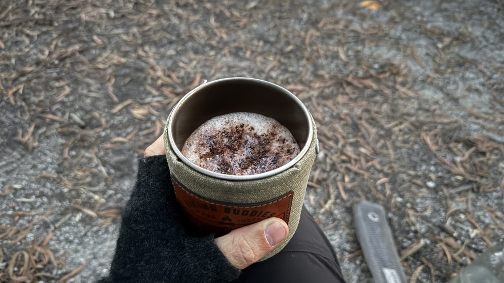 Mia says that she’s had nothing but kindness and generosity from people here, and she insists I join them at their camper where she loans me the use of a camp chair and while Roux cooks their dinner she makes me an amazing hot chocolate. It’s an intricate affair with at least two pots and paraphernalia. Mia is a barista. On the strength of that one mug, I’d say Mia is probably an excellent barista.