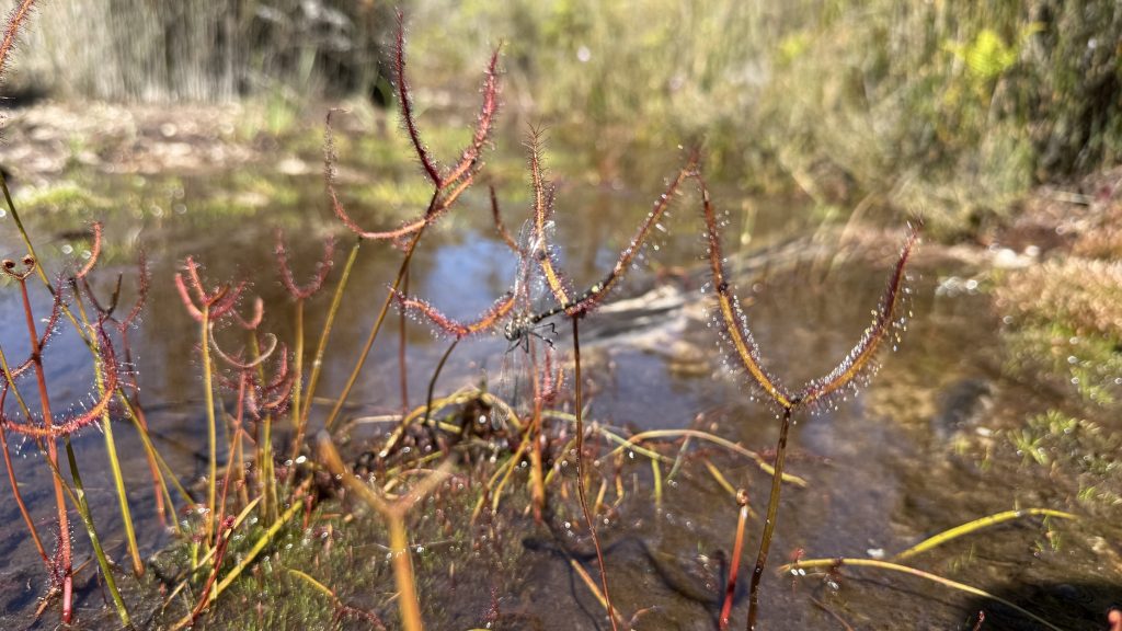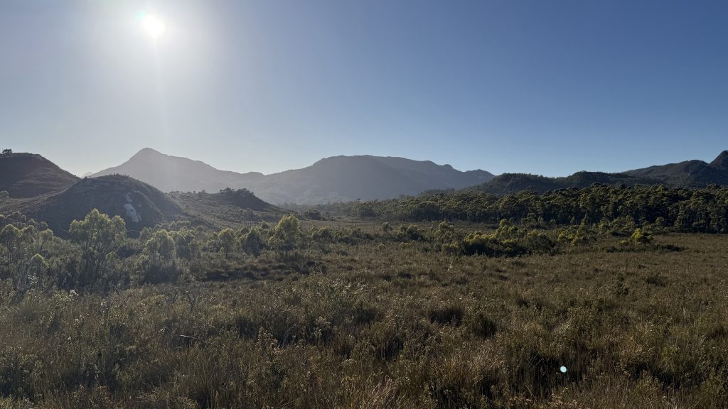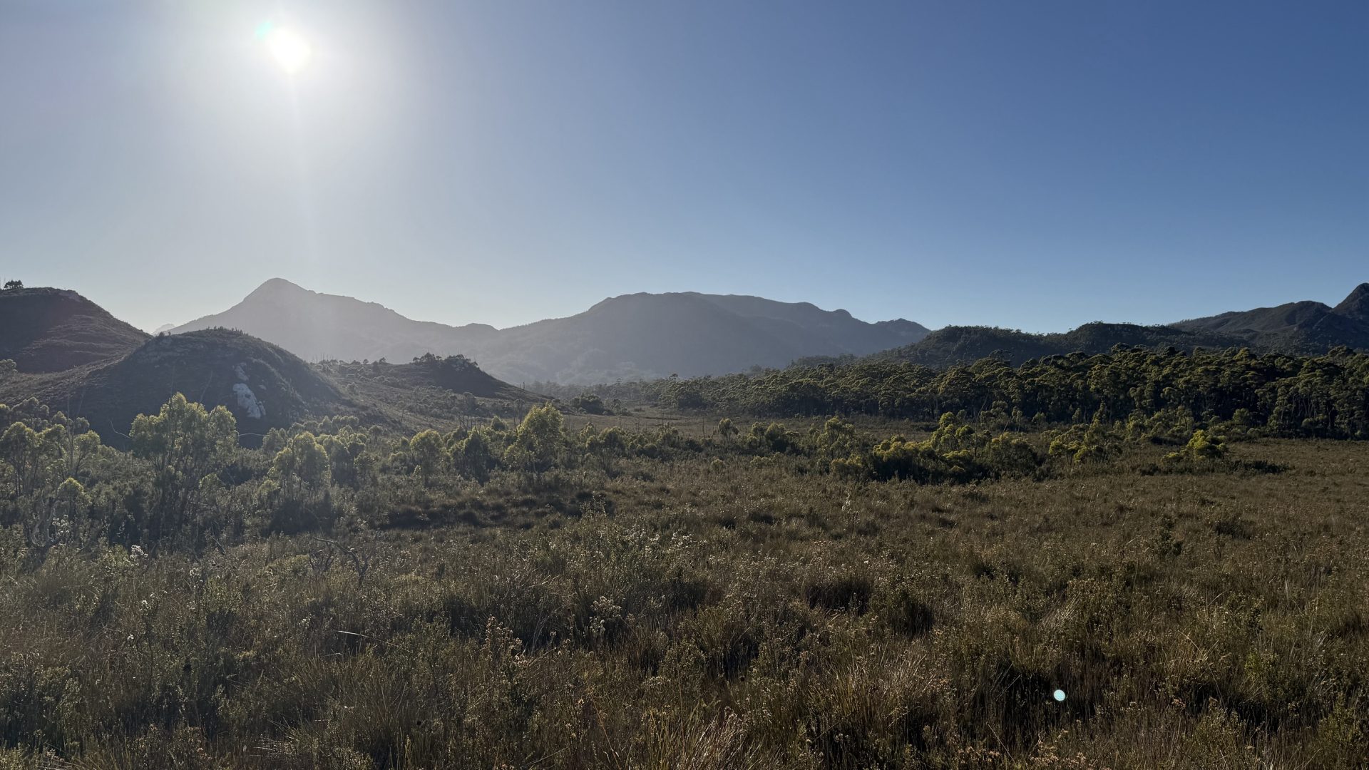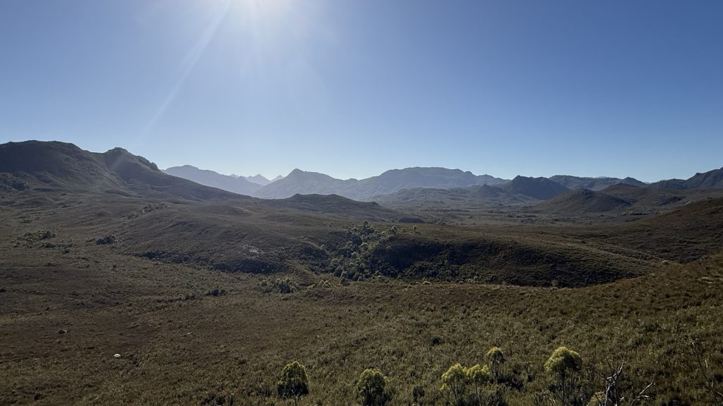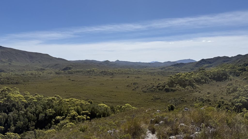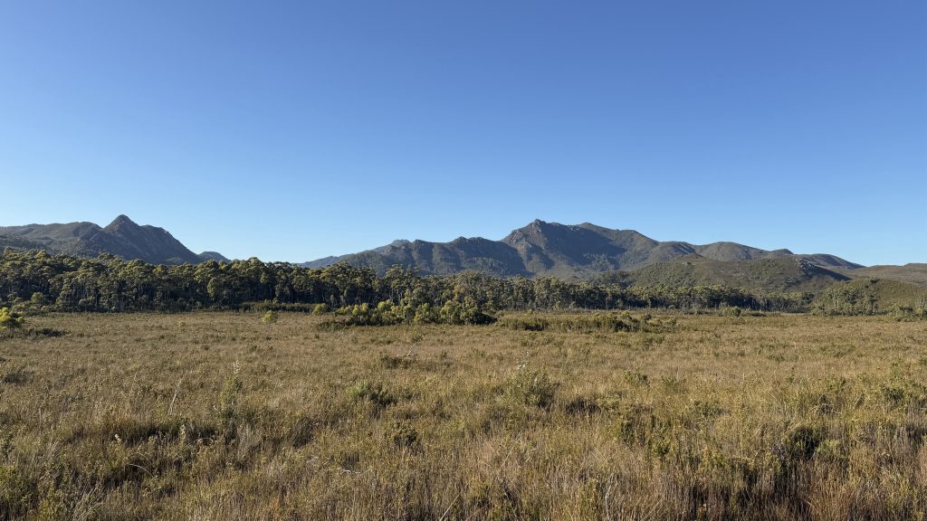Straight out of camp, it’s mud and dense trackside scrub wet with the morning dew. But then after about a kilometre it opens into buttongrass and the walking is easier for a spell. I feel like my descriptions of this trail are becoming tediously repetitive. The landscape changes only slowly and by tiny degrees.
