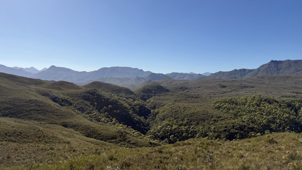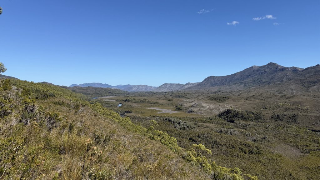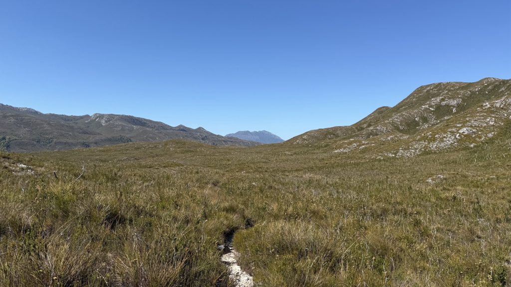 From Spring River the trail stops contouring the hills and takes a more direct route along a shallow ridge of small hills. Bathurst Harbour begins to show itself in the distance, and the landscape is at last changing.