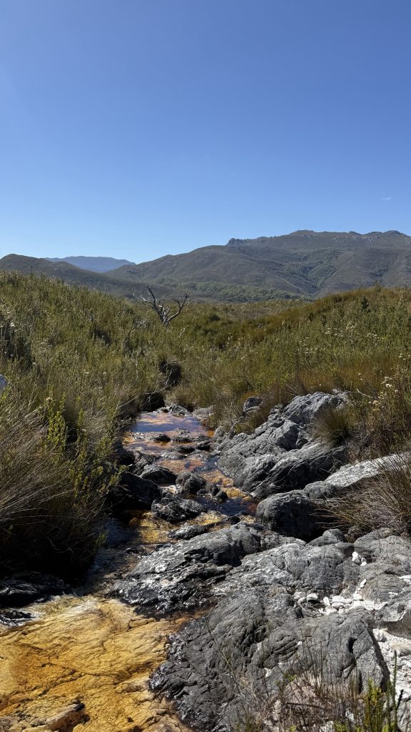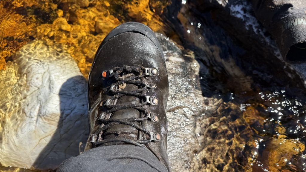 I stop by a creek to filter some water and have morning tea, and notice I’ve suffered a near-catastrophic shoelace failure. Luckily with my extensive knowledge of knotwork, I am able to fashion a repair.