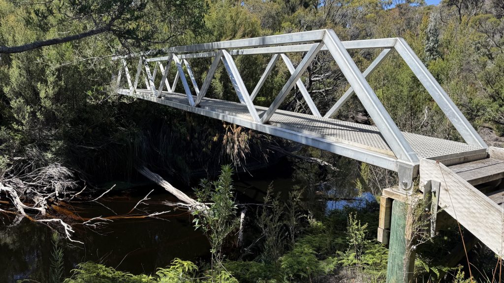 I stop for a late lunch and to air my feet at Spring River campsite. There’s a bridge set high above the river; welcome indeed, but an oddity on this track that shows very little sign of clearing or hardening. The campsite before the bridge is nice. Chapman says there’s a better one on the far side, but I found no sign of it, just a game of pick up sticks and dodge-tree before the buttongrass.