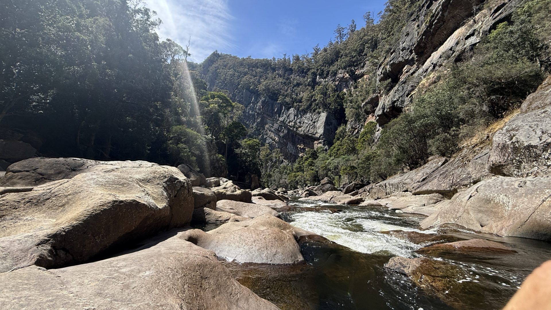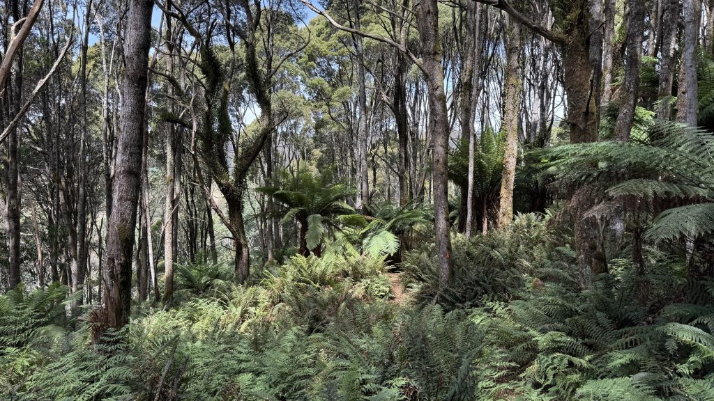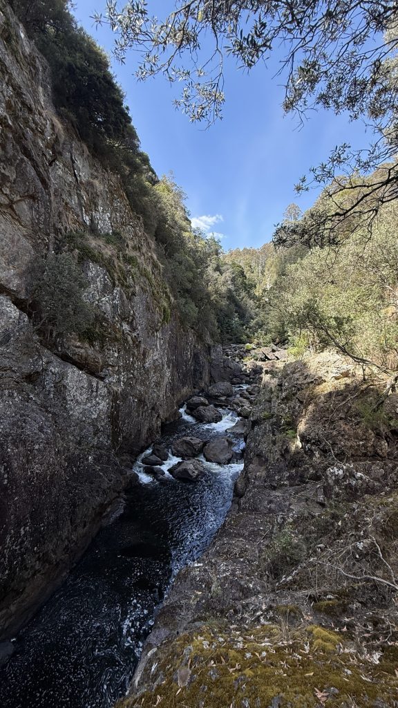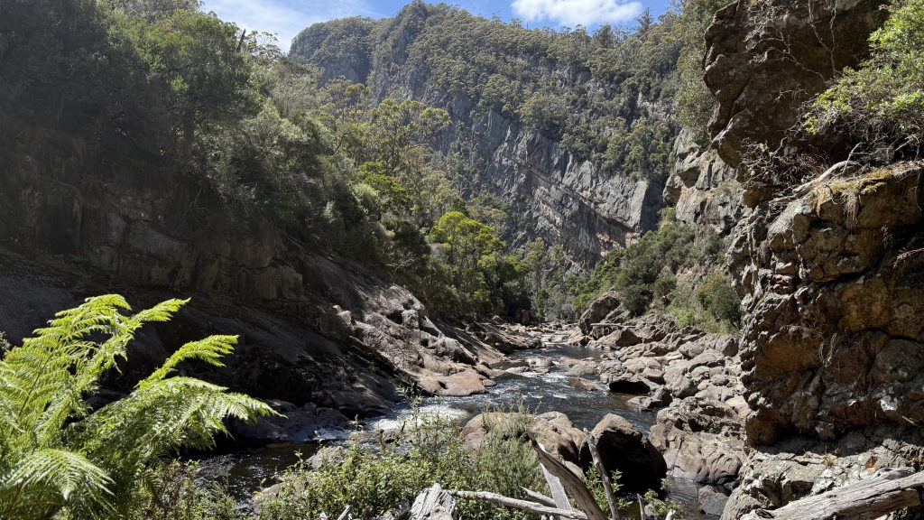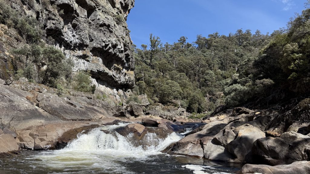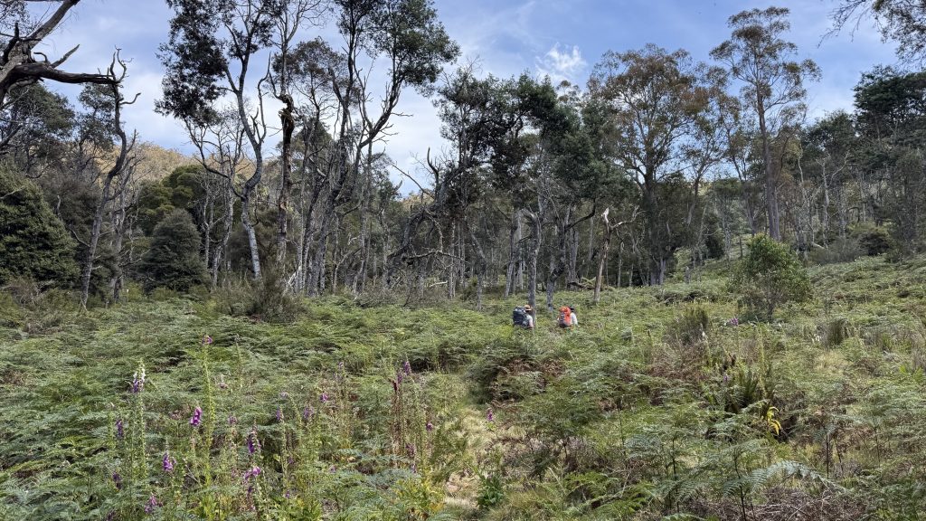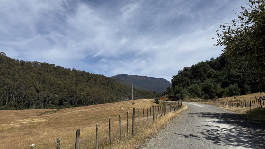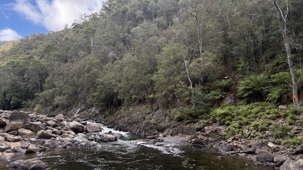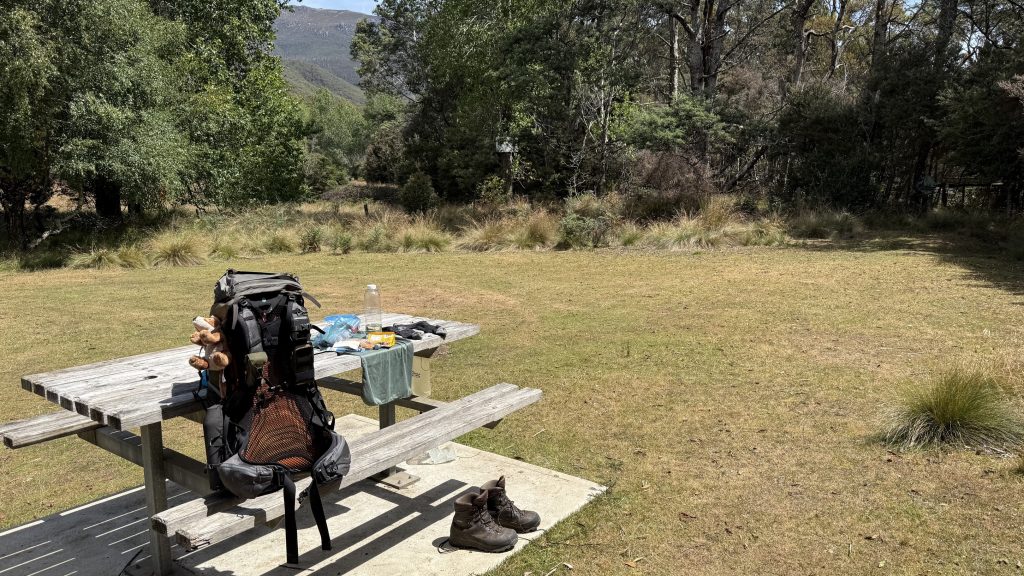 The track exits the canyon as the land opens up, but climbs through a sea of chest-high bracken to skirt some private property. Then it’s over a rickety wooden stile and down a couple of kilometres of gravel road to the cabins at Loongana where Bec and Kieran have booked accommodation for the night. I continue over the bridge to a grassy picnic area and take my boots off to air my feet and consider how much more climbing I want to do today. If I don’t climb to Paddy’s lake, I’ll have to do it in the morning, and tomorrow will already be a big day to cross the tops of things and drop down to shelter and trees for camp. The March flies in the picnic area are annoying, but slow and stupid. The sun is bright and warm, and the river flows lazily, unceasingly past.
