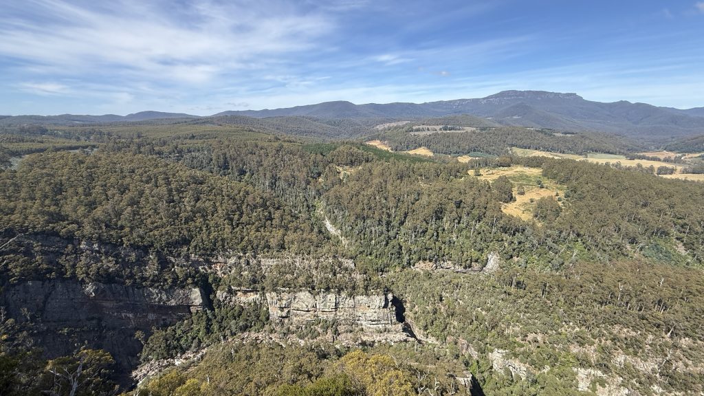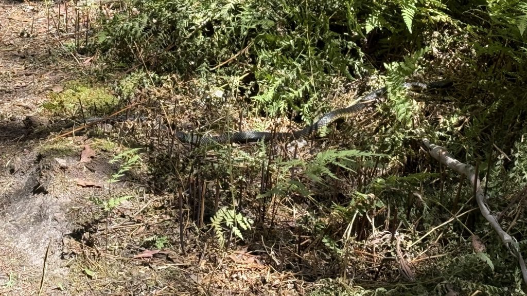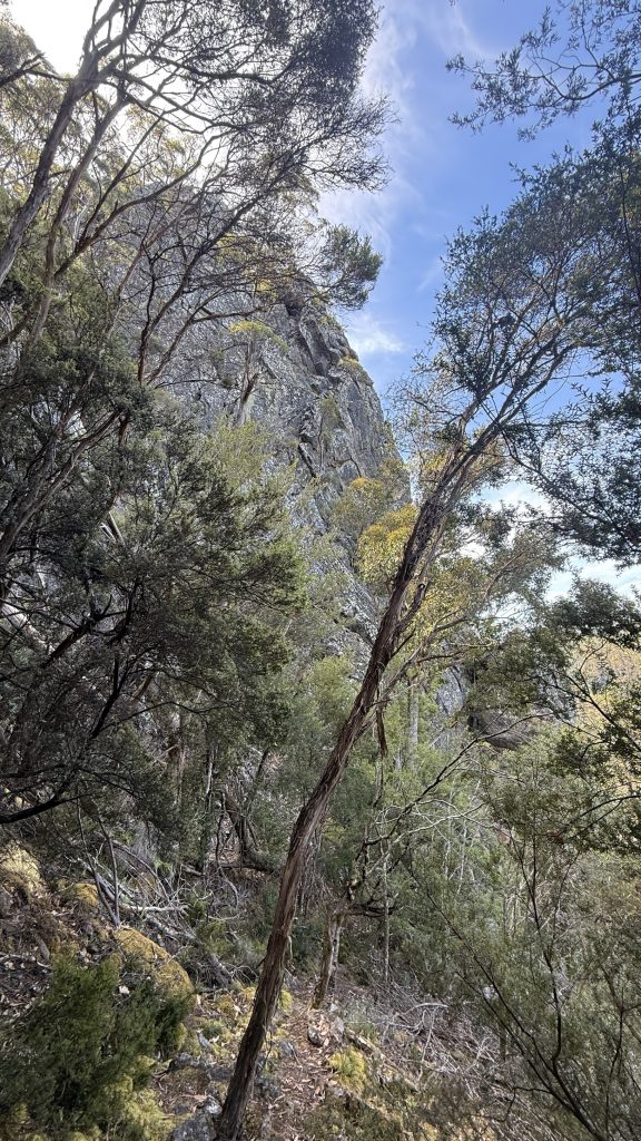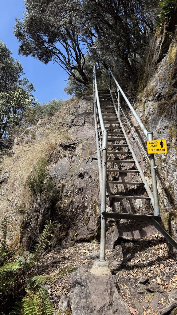 I come down a couple of steel ladders set into the rock and stumble into a couple of hikers having their lunch. Bec and Kieran are from Canberra and Tassie, and they’re doing the PCT to complete Bec’s Tassie Traverse. We walk together for a while and I ask about the trees we walk past. There are silver wattle, and blackwood (also an acacia), which was growing back at camp and used to be used in furniture s lot but has fallen out of favour due to the carcinogenic sawdust. Also sassafras, the timber of which I’ve worked with. Bec says you can make tea from the leaves. I crush one and it smells just like the timber.