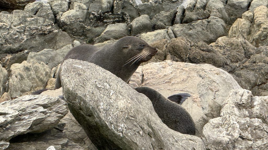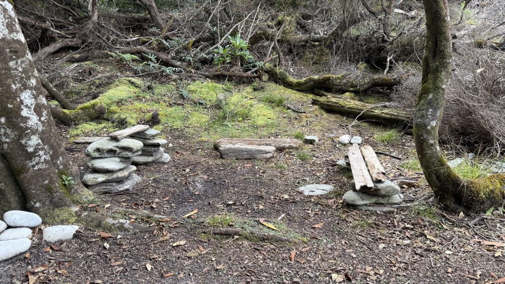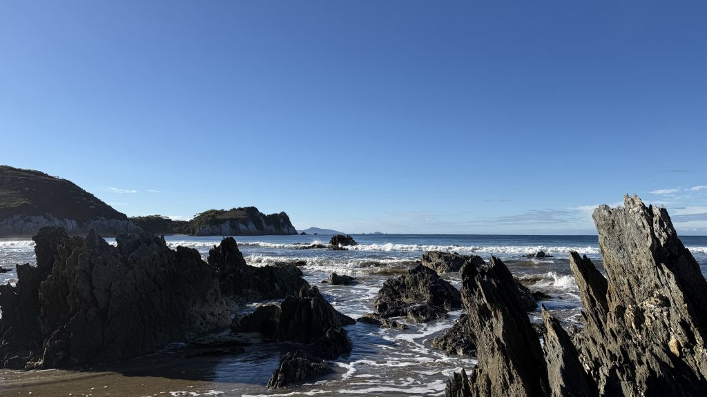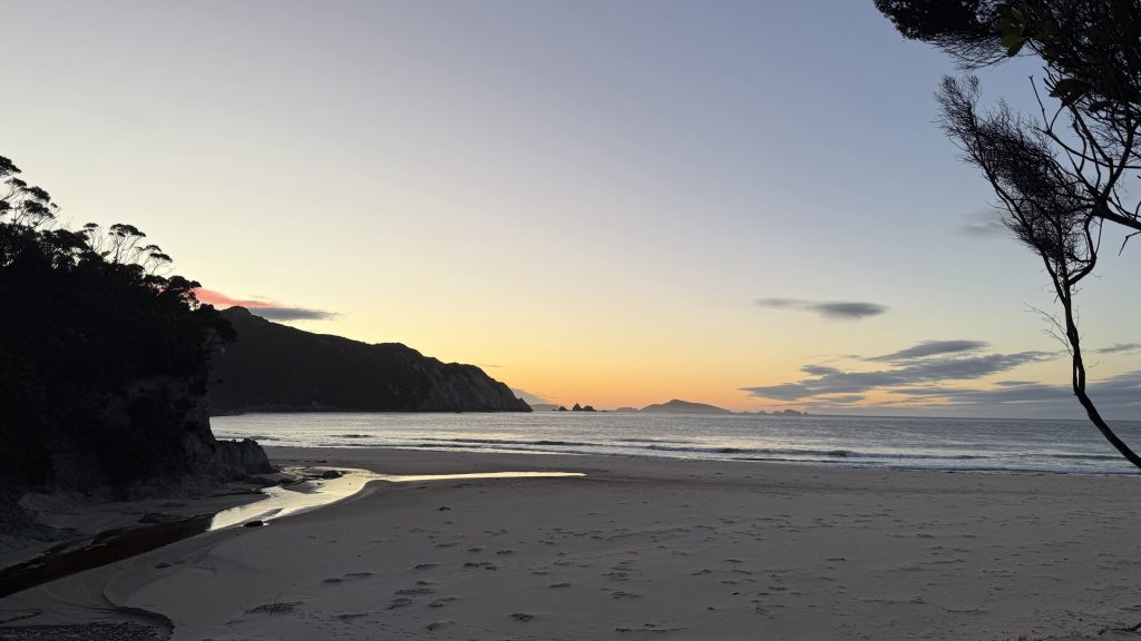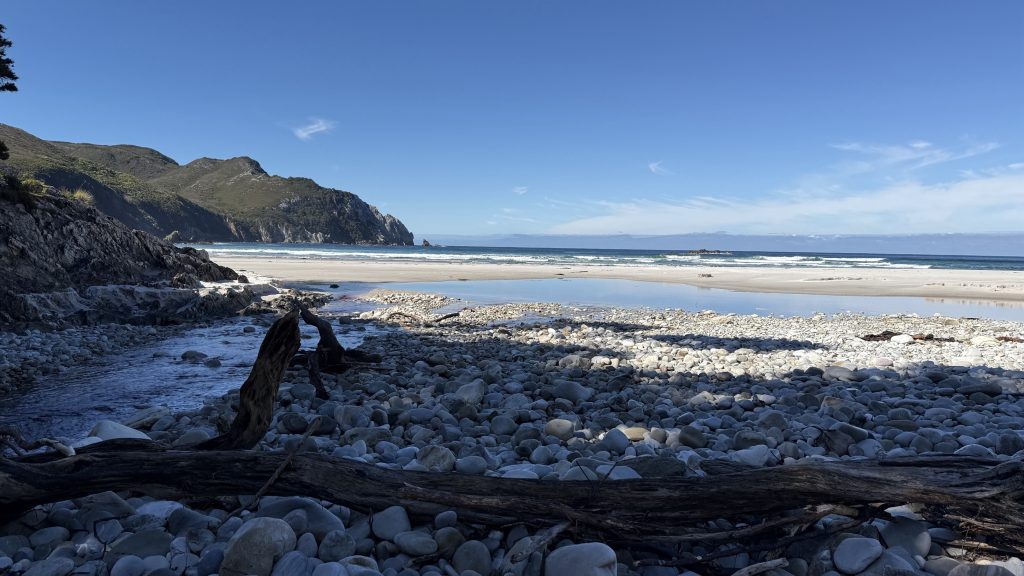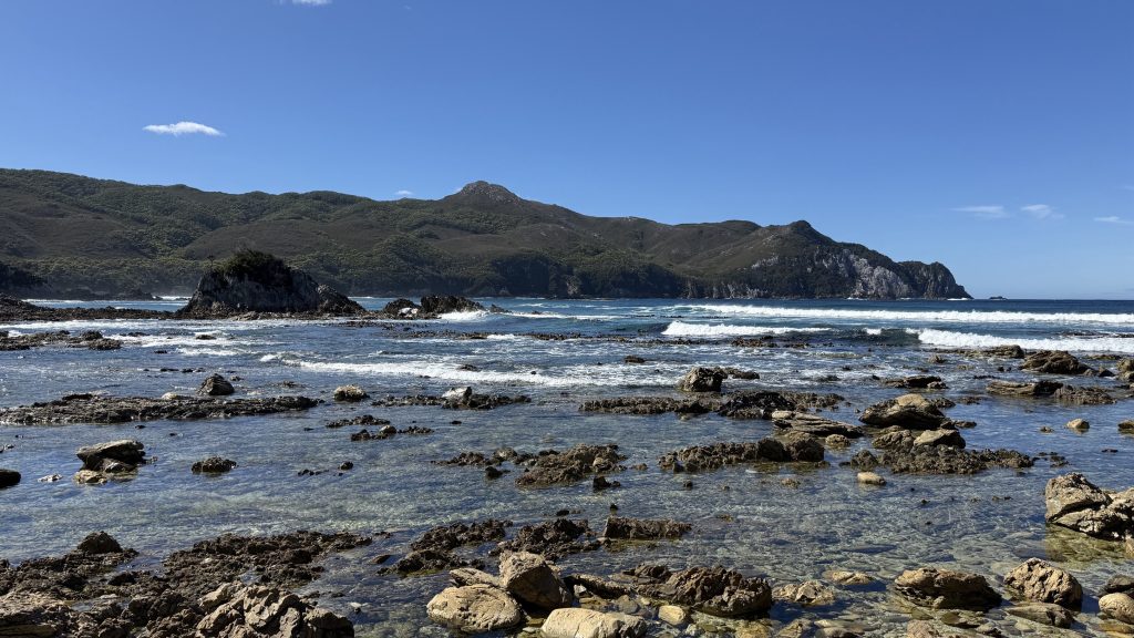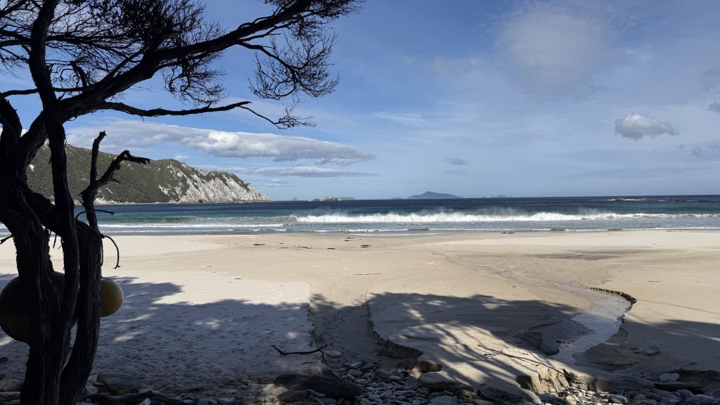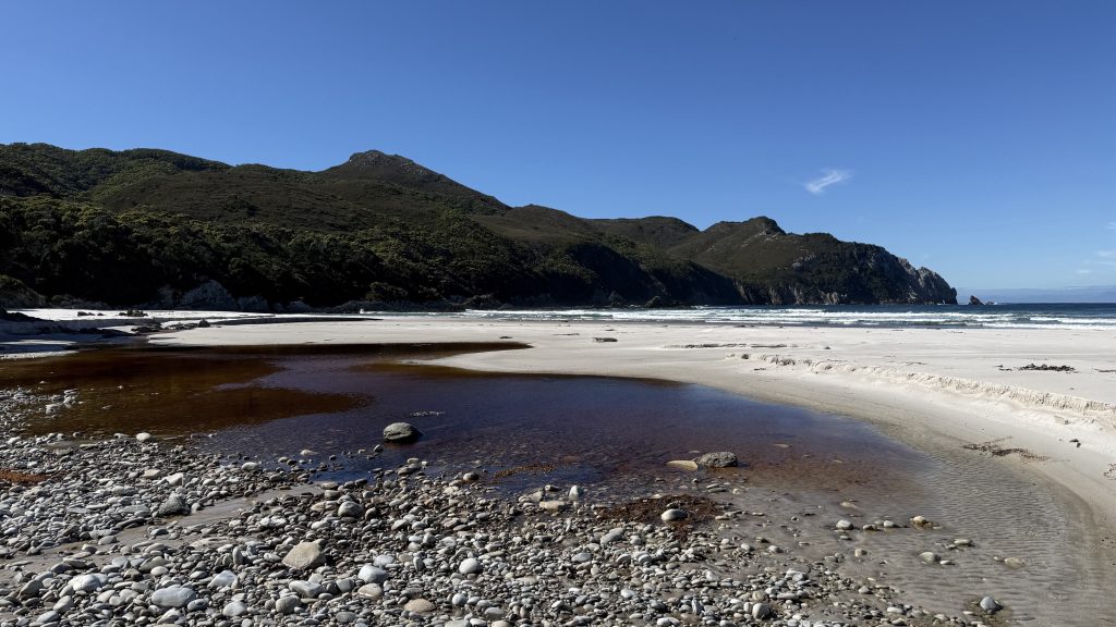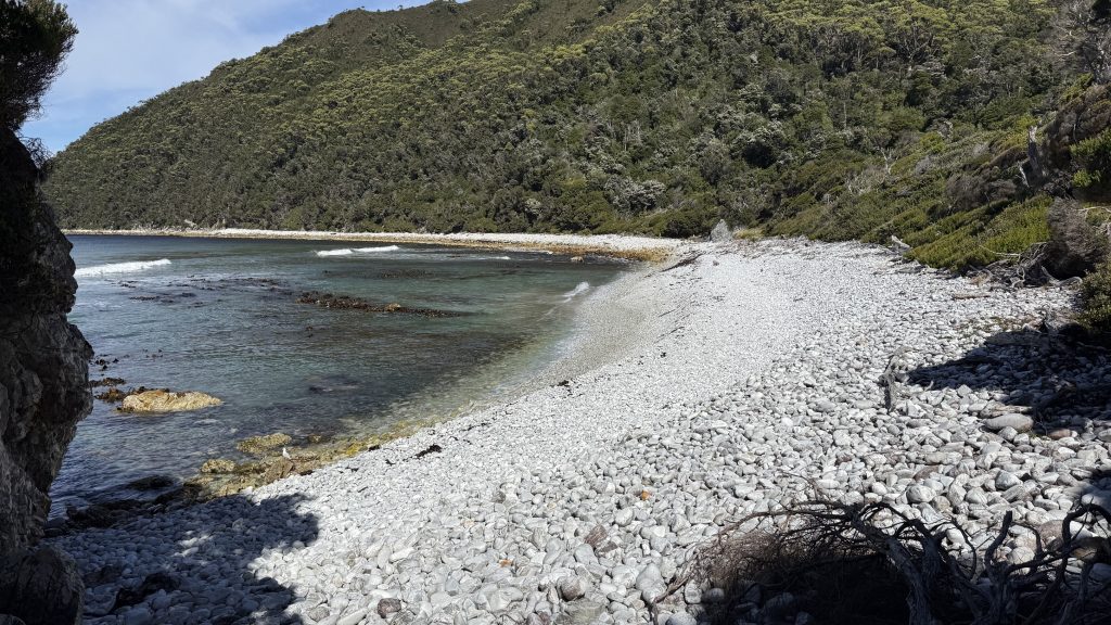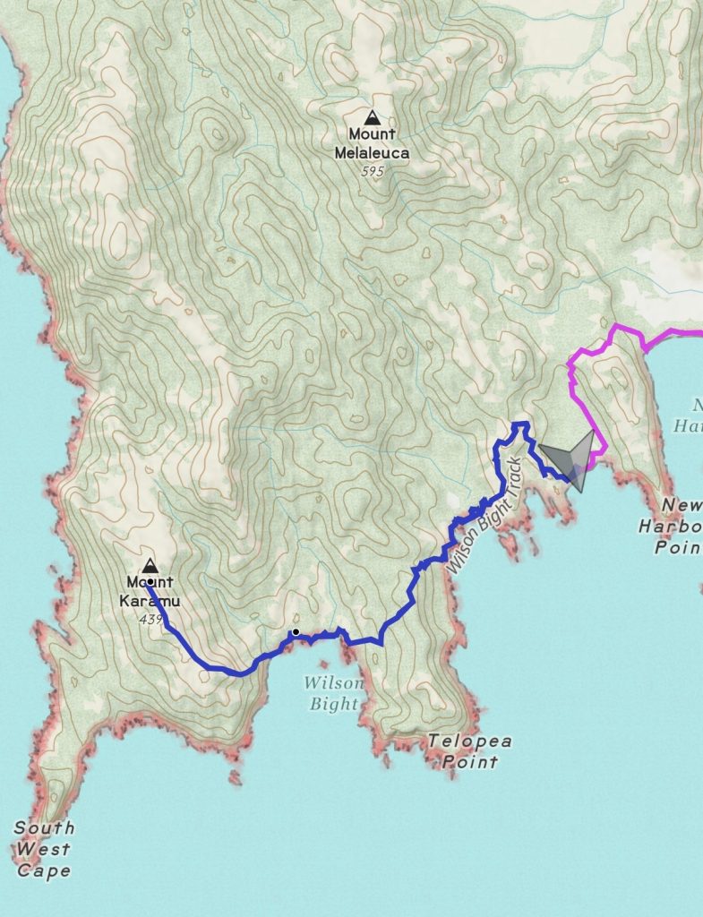 Wilson’s Bight is also beautiful. I think it’s high tide, and there’s a bit of a rock scramble to get across the full length of the beach. A waterfall cascades over mossy rock. I sit and have a late morning tea. If I make it all the way to Mt Karamu it’s probably going to be a long day, but I’ll start climbing and see how I feel about it.