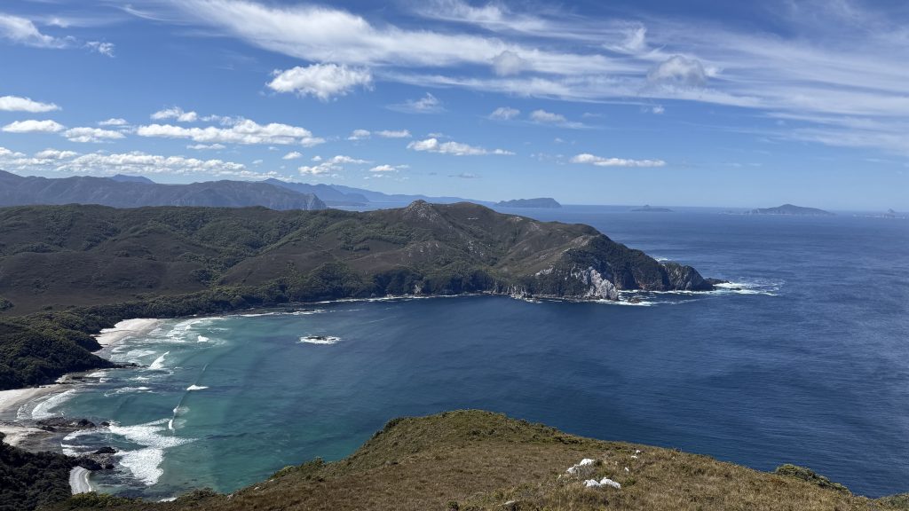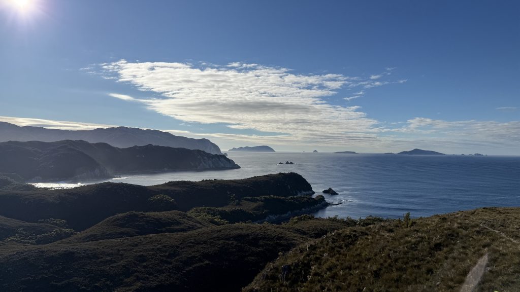 The climb up the spur is short, sharp and scrubby. There’s a fixed rope in place for some of it. Then it’s mostly an open rolling series of climbs, past the South West Cape, to the top of Mount Karamu.