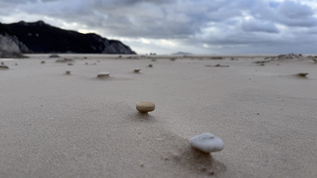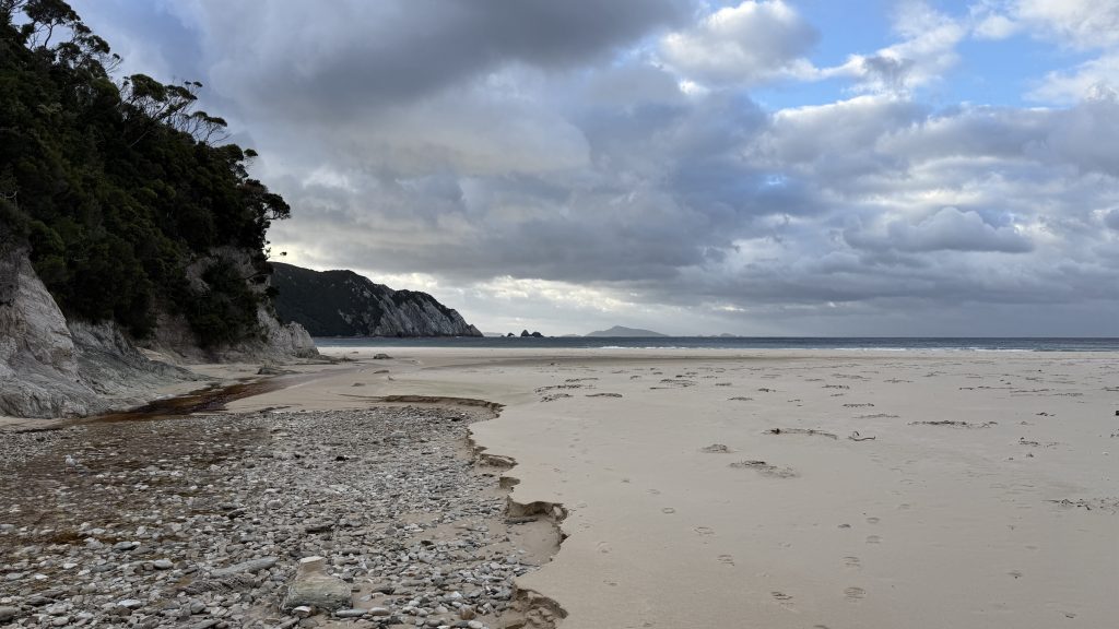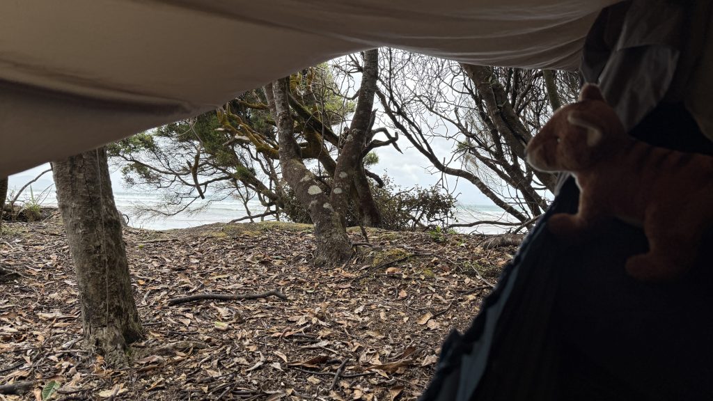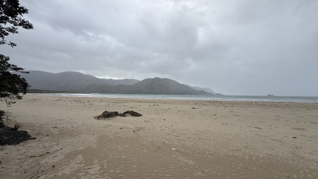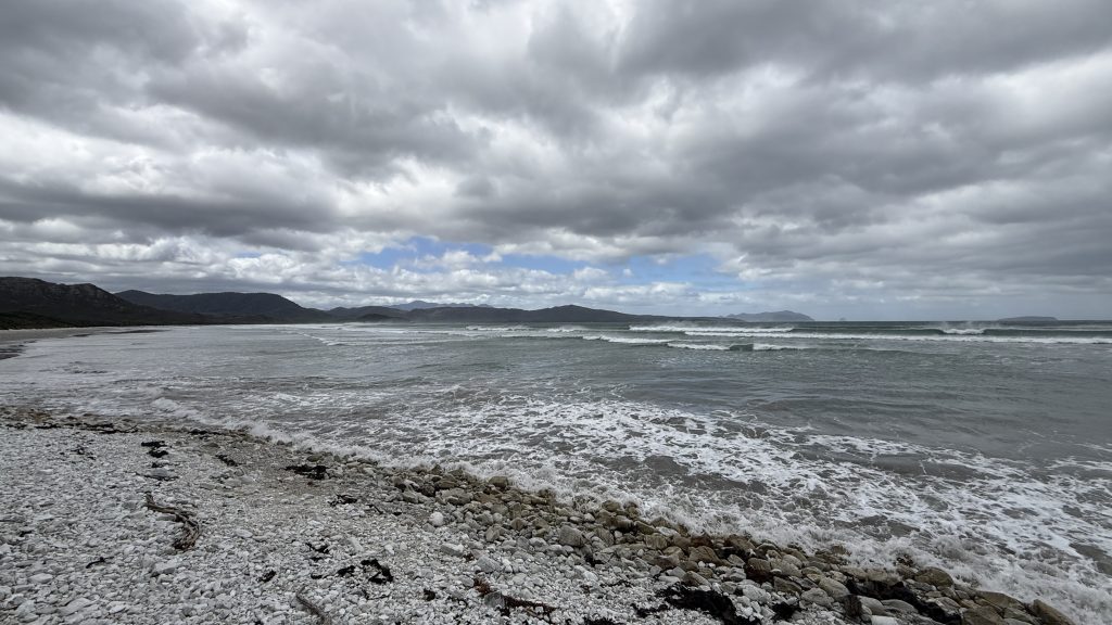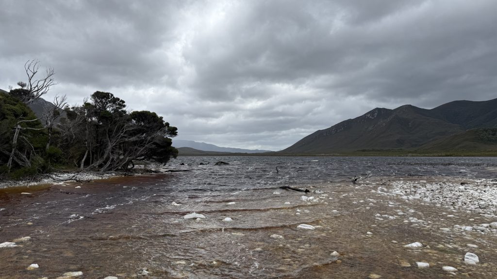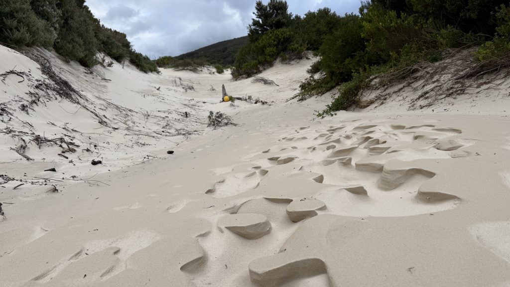 At Freney Lagoon campsite near that freshwater body’s outlet into the ocean, I decide to camp for the night. There are sheltered sites in amongst the scrubby trees, and while it’s still rather windy in there, I’ve felt how strong the wind is in exposed areas. It’s possible Point Eric would have been better, but this will do, and I don’t want to push my luck and find there are no better campsites further on. Plus there’s an enclosed toilet I can cower in if need be.