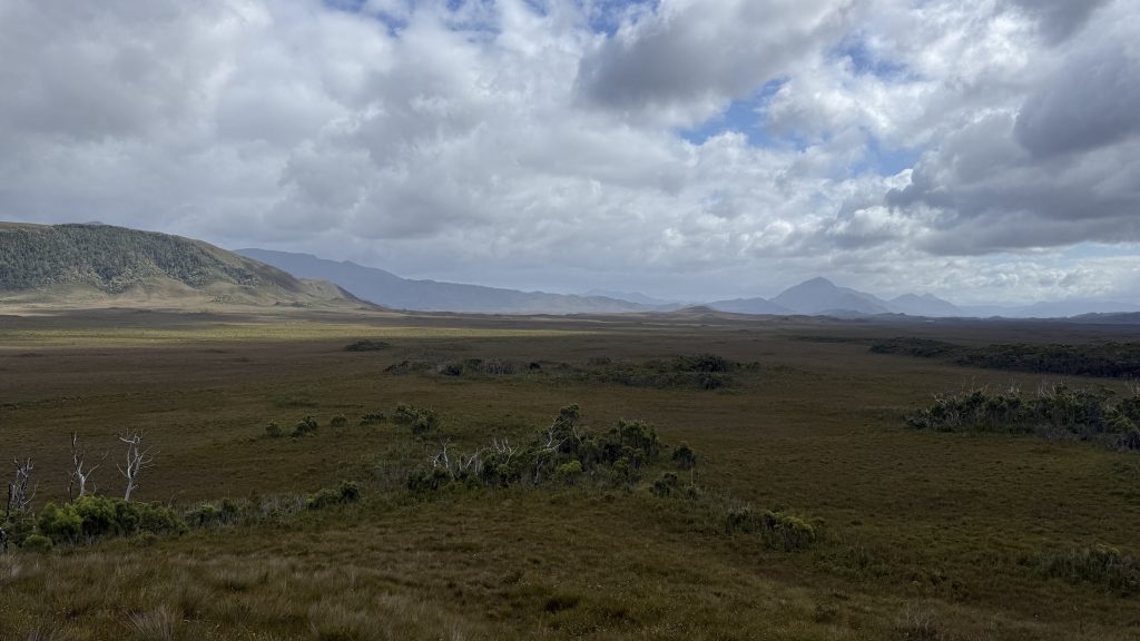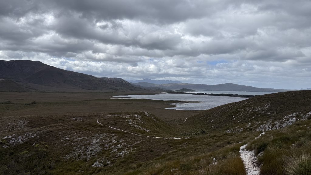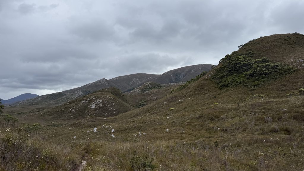 I spend the walk to the track junction considering whether to turn tail to Melaleuca, adding 5km today and 5km tomorrow, or continue as planned. I decide to press on. The wind is coming from the north-west, and I think the chances are good of finding a decently sheltered campsite.