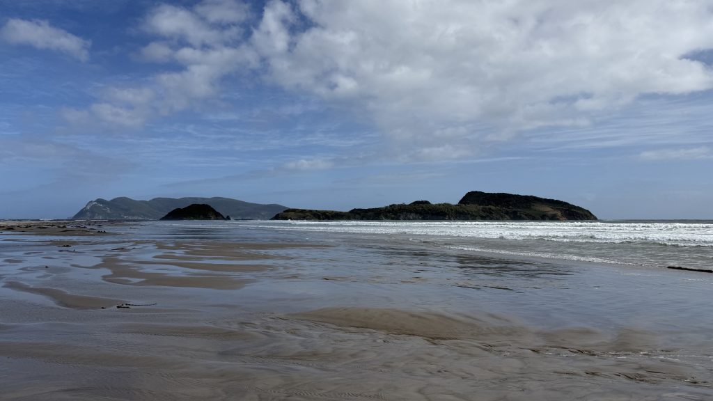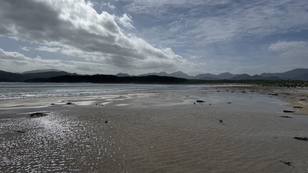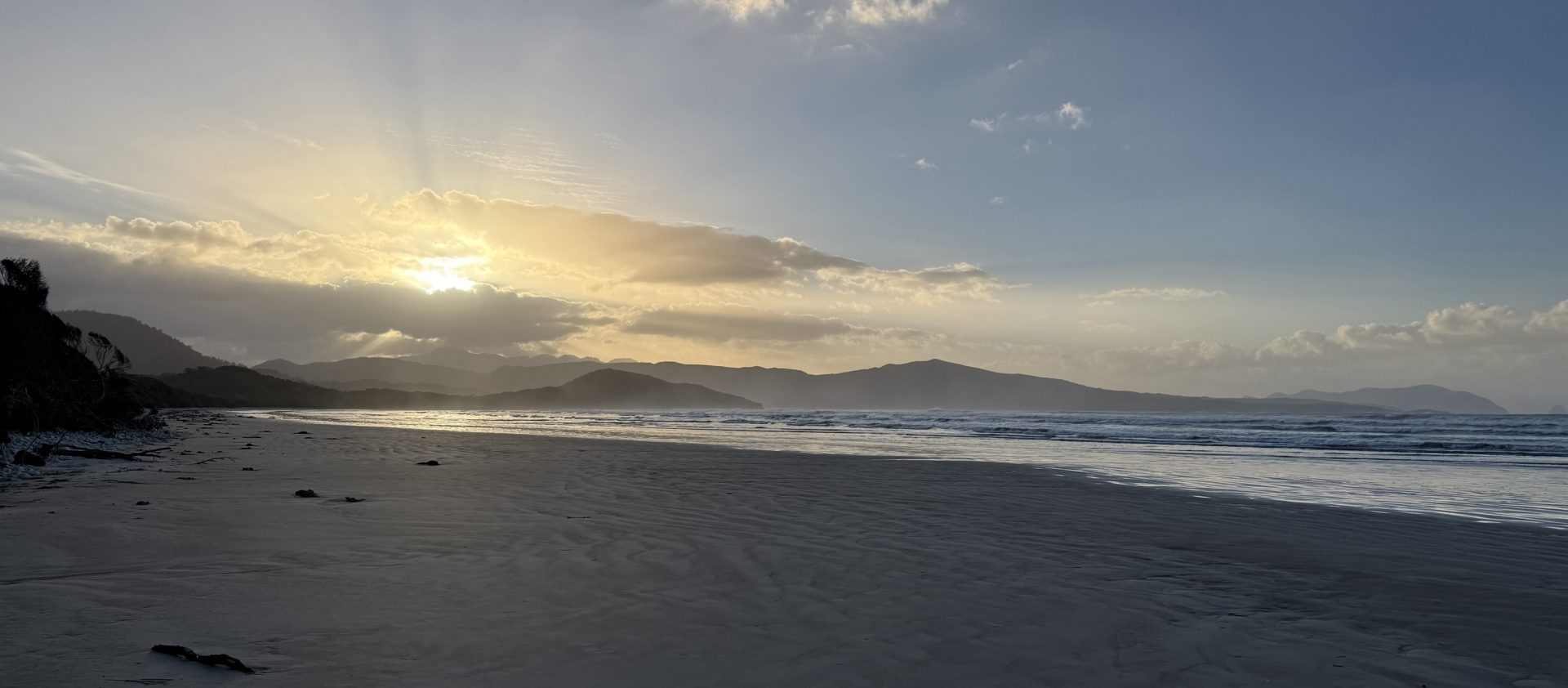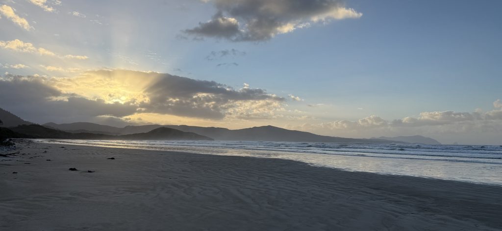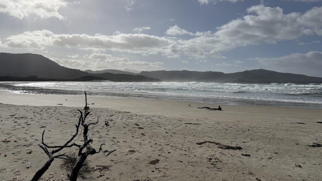 Walking along the broad flat beach in the morning sun feels fantastic. It’s hard to reconcile with yesterday’s weather. Tassie may have some wild weather, but it changes so quickly all you have to do is wait.