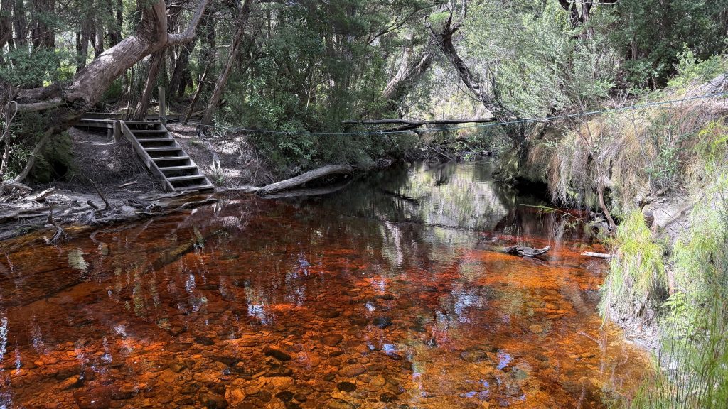 I imagine it’s the same tannins that stain all the waterways around here that make the mud acidic. I think it’s from the buttongrass, though the tea-trees probably help.