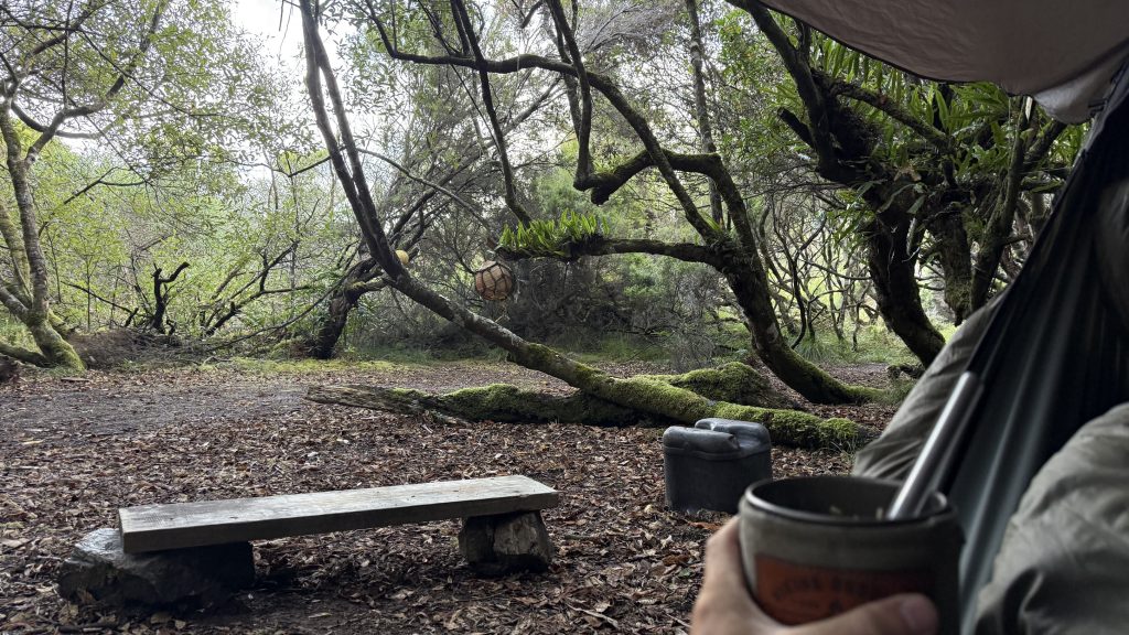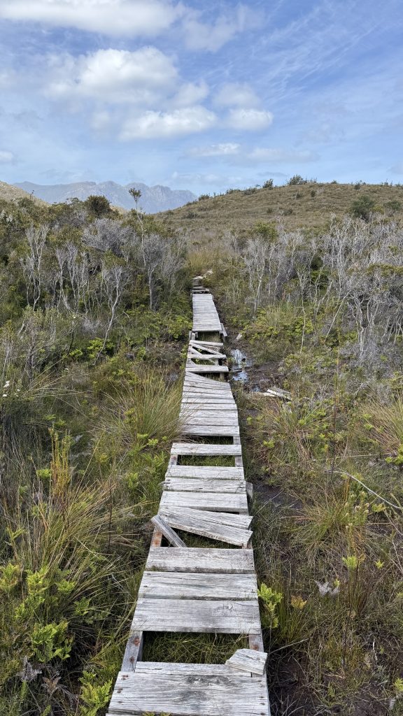 I feel a bit proud that the tarp I made for this trip, the one with the rock-hole I hastily patched in Hobart, has weathered the powerful gusts of wind last night without ripping or failing at one of the tie-out points. I’m glad I chose not to chicken out back to Melaleuca. I need more experience of adverse weather so I know better what I can handle in future.