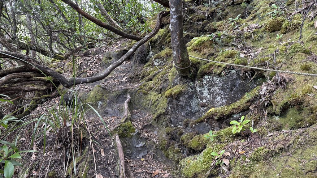 I spook a snake within 200m of the campsite, not far before the decline. Probably a copperhead. It’s the first I’ve seen since back on Tiger Road in the Florentine valley, and I’d kinda gotten out of the habit of keeping an eye out for them. It was sitting on the side of the track at about thigh height, and I got within maybe a foot of it. Close one.