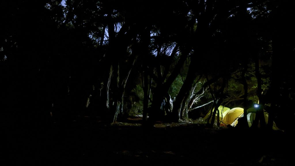 The group that came in late are up an hour before sunrise, their bright headlamps strafing the campsite and forest as they break camp as quietly as they can.
