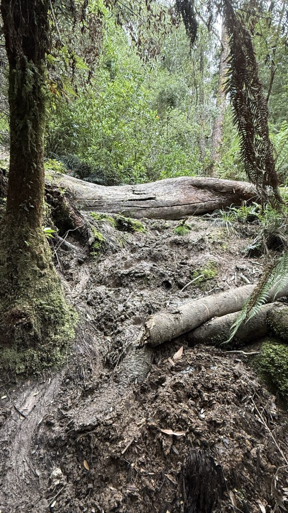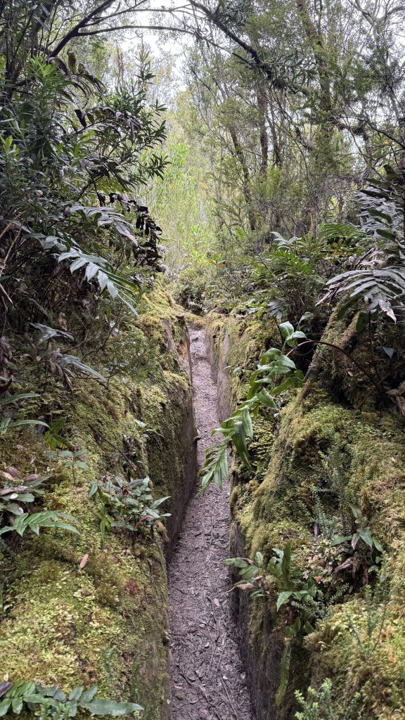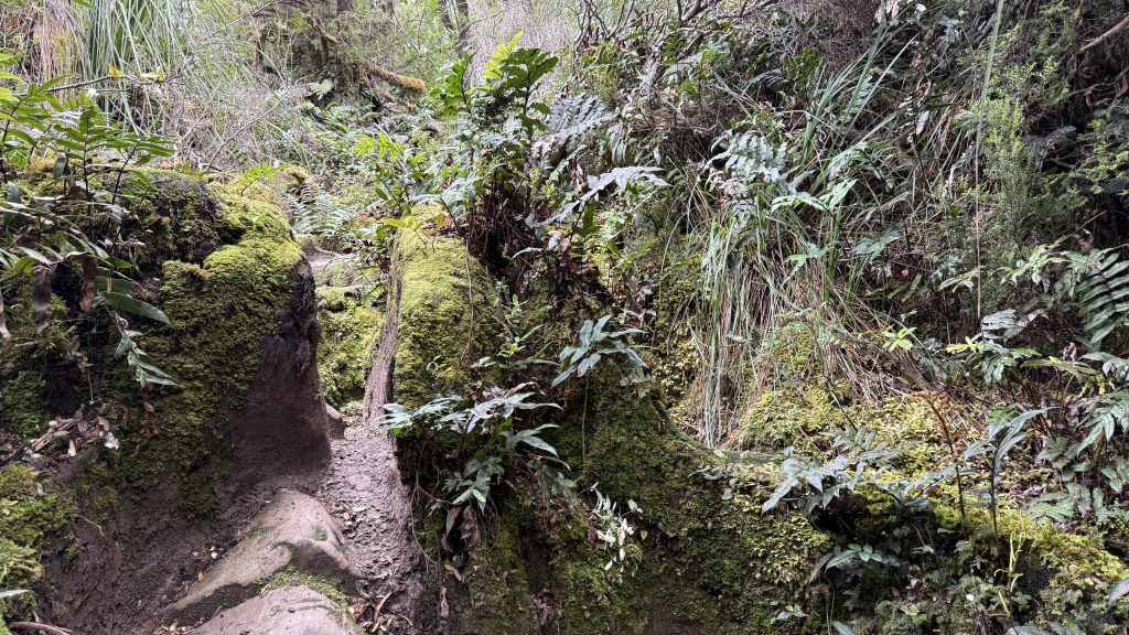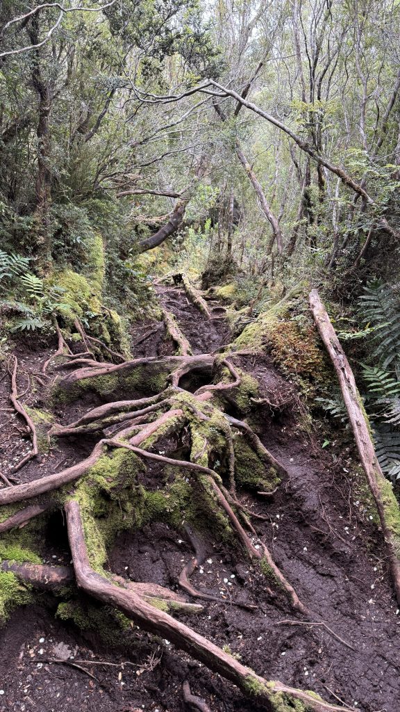 Back up to the track junction, then eastward again. I misjudge some mud, and go in up to the top of my thighs. I’m pretty annoyed with myself for that. I’ve been stepping or jumping over anything that seems deeper than calf depth. I don’t mind getting my feet muddy, but I’d rather not go in deeper than my gaiters. My feet are still dry though. Turns out today is the day the track ramps up to Kokoda levels.