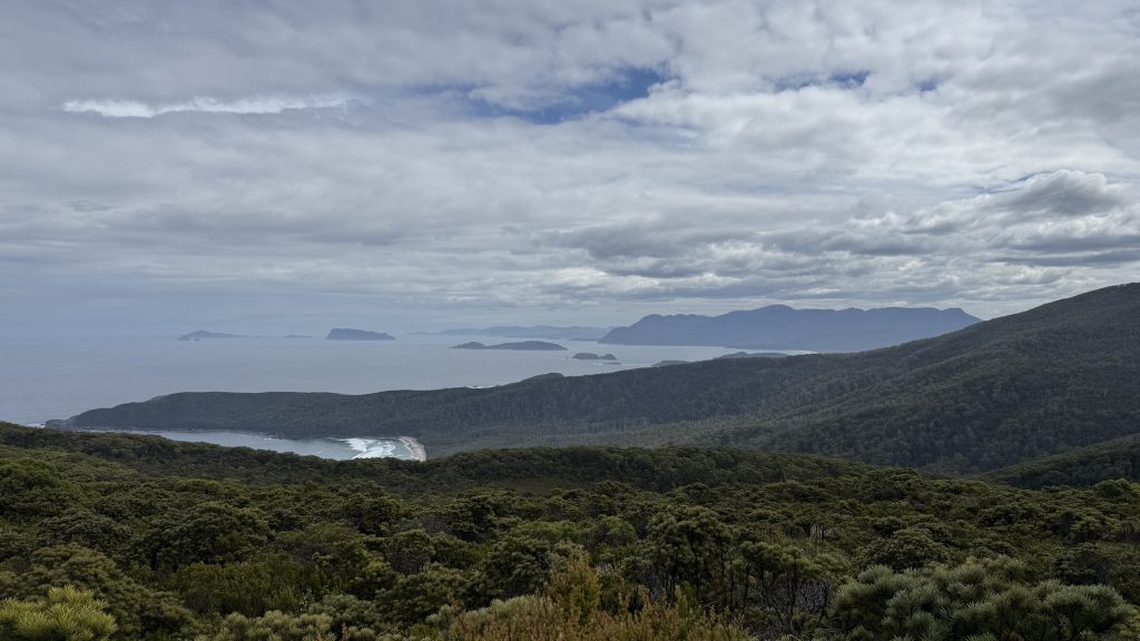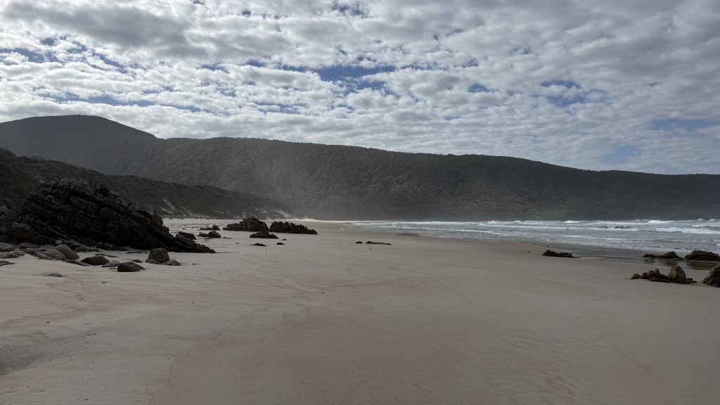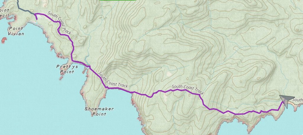 It’s only 12:00 when I get to Granite Beach. I eat lunch with a view of the ocean. There’s one day of decent weather left. I’d rather finish like that than in the rain. Plus there’s plenty of daylight left. I decide to keep going, though everyone says the next 9km over the South Cape Range is a ride on the struggle bus. Chapman says 5 to 7 hours. Parks says something like 6 to 8. I’ll be pushing hard, and it might be late by the time I get to camp, but it’ll make for a nice easy walk tomorrow.