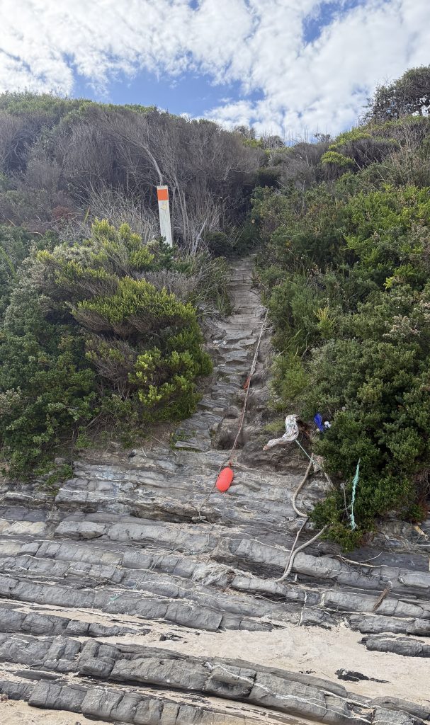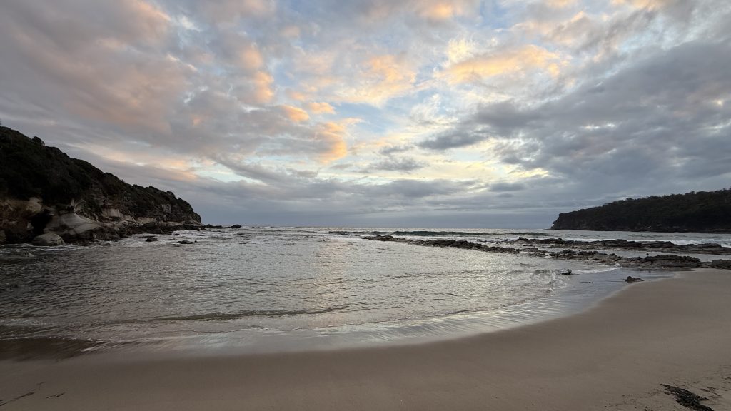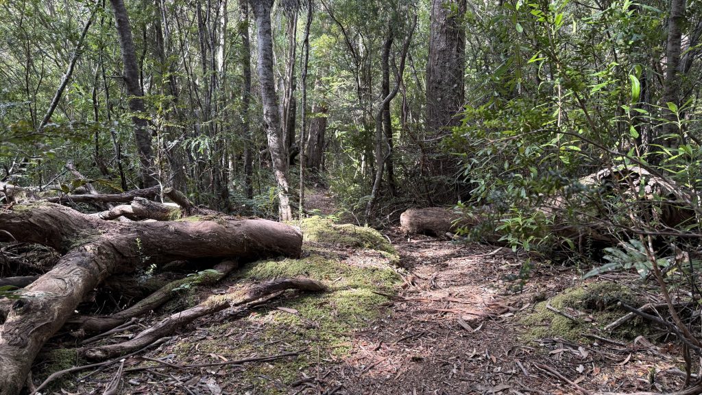 A sharp little 150vm climb to the top of the ridge has me puffing and my muddy trousers dry. A forecast update has Wednesday with 13mm of rain again. Anne, my ride at the end, is piking out of camping at Cockle Creek. I’m considering my options. I’ll have lunch at Granite beach and consider.