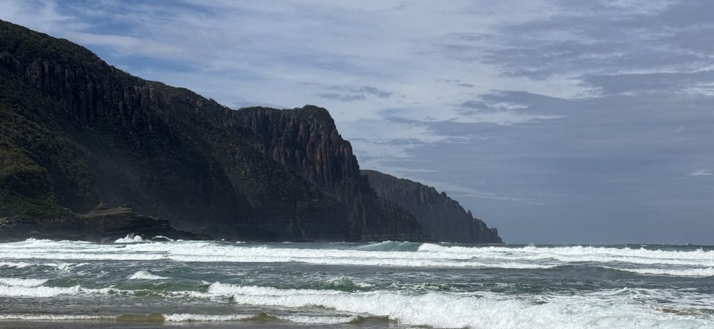 Granite beach looks out eastward on towering dolerite columned headlands; the feet of the South Cape Range disappearing into the relentlessly churning ocean.