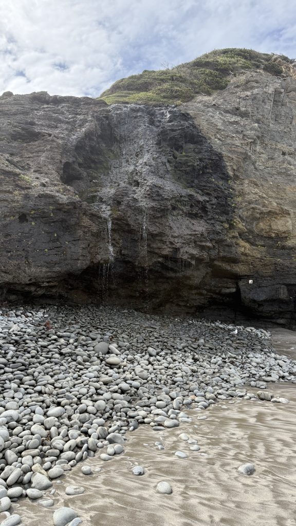At the end of the beach, a little waterfall drips off the rocks. I wash my head, then give my shirt a good wash out and put it back on to dry. I’m tempted to have more of a wash, but I passed a couple of guys at the other end of the beach and they’ll be along any minute.