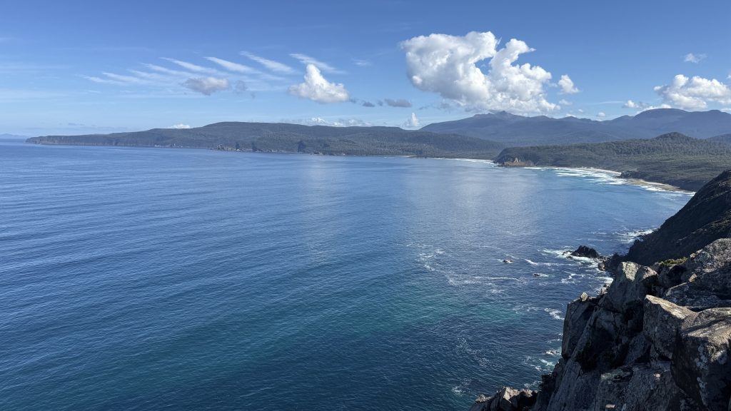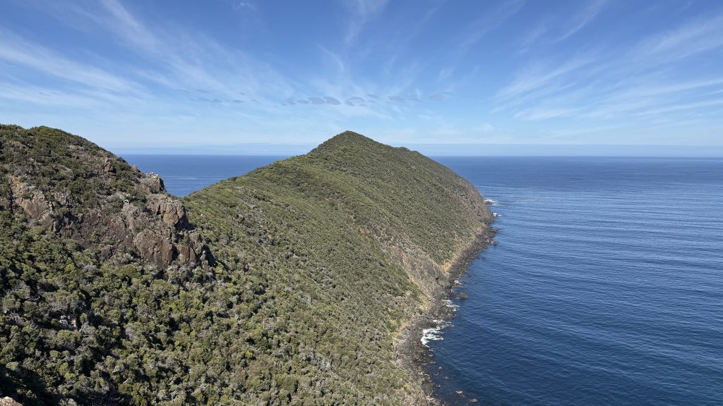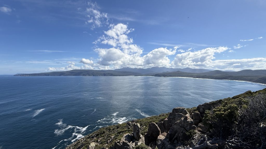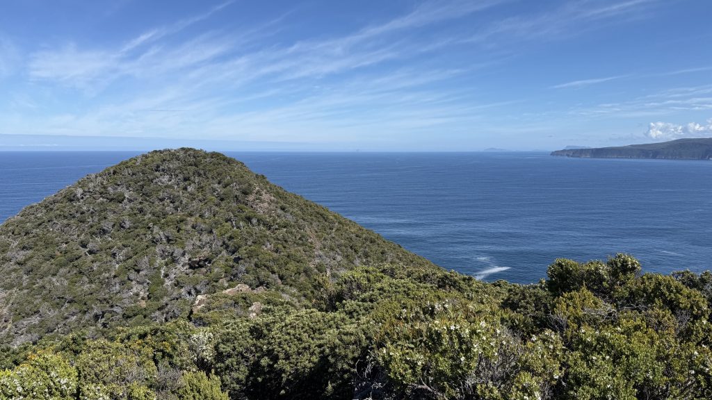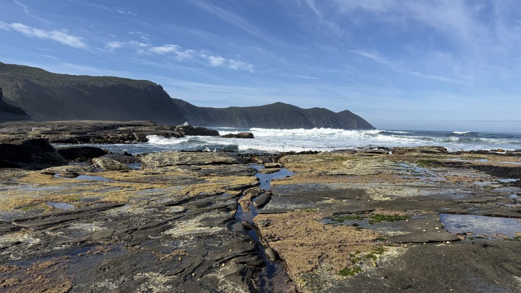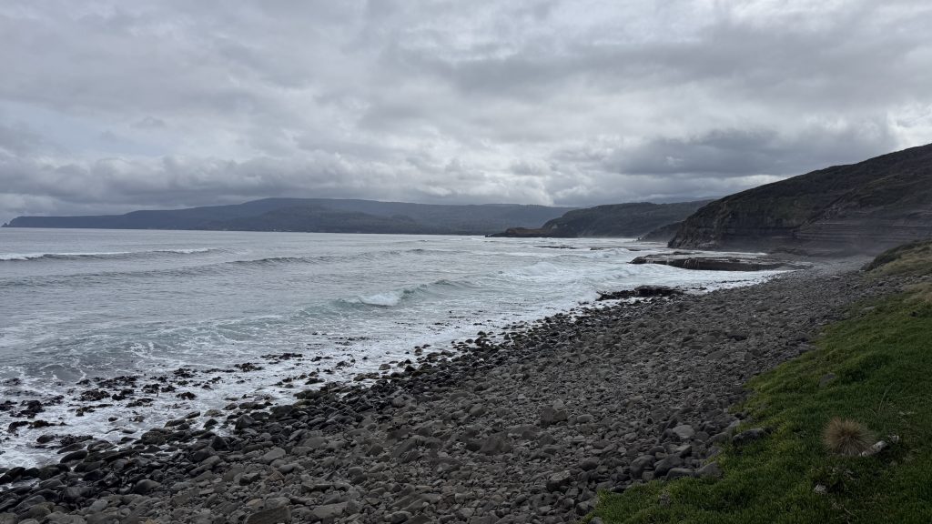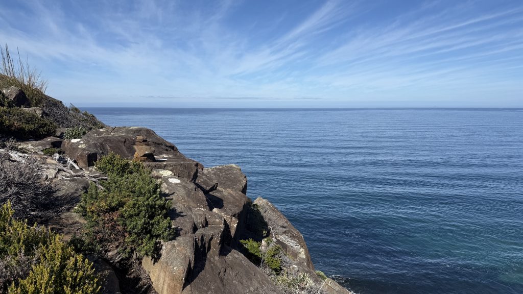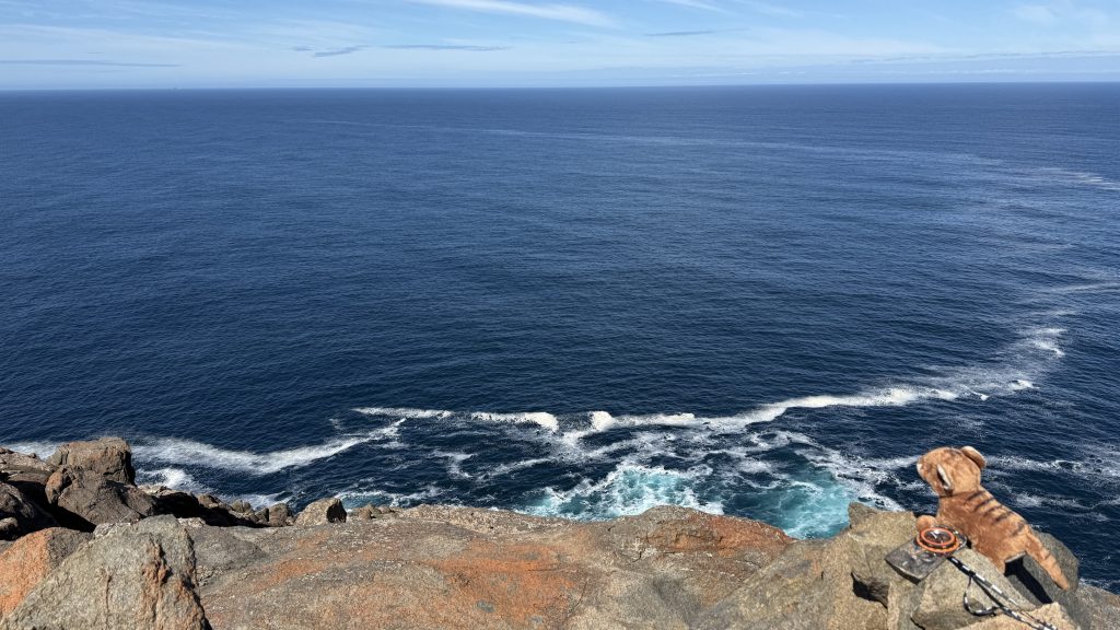 I sit and eat my lunch and look out across the vast blue ocean towards Antarctica. Small boats sporadically make their slow way around the cape. The waves smash and churn themselves to foam on the rocks below. The sun is warm on my back, the breeze is gentle, and everything is quiet and slow. I’m grateful to myself for pushing on yesterday so I could have such beautiful weather for this bit today. I’ll have to start back soon, but for now I want to savour this.