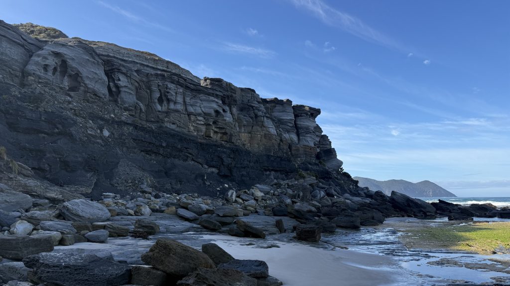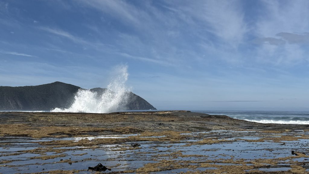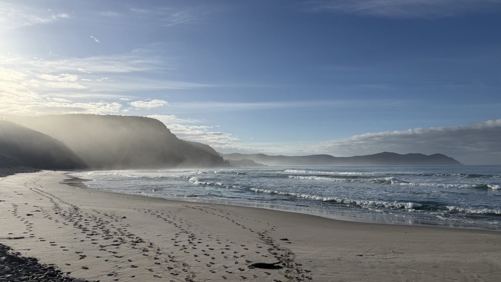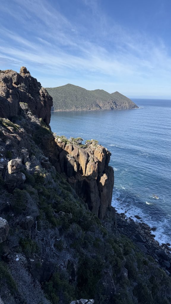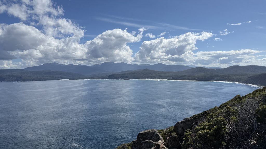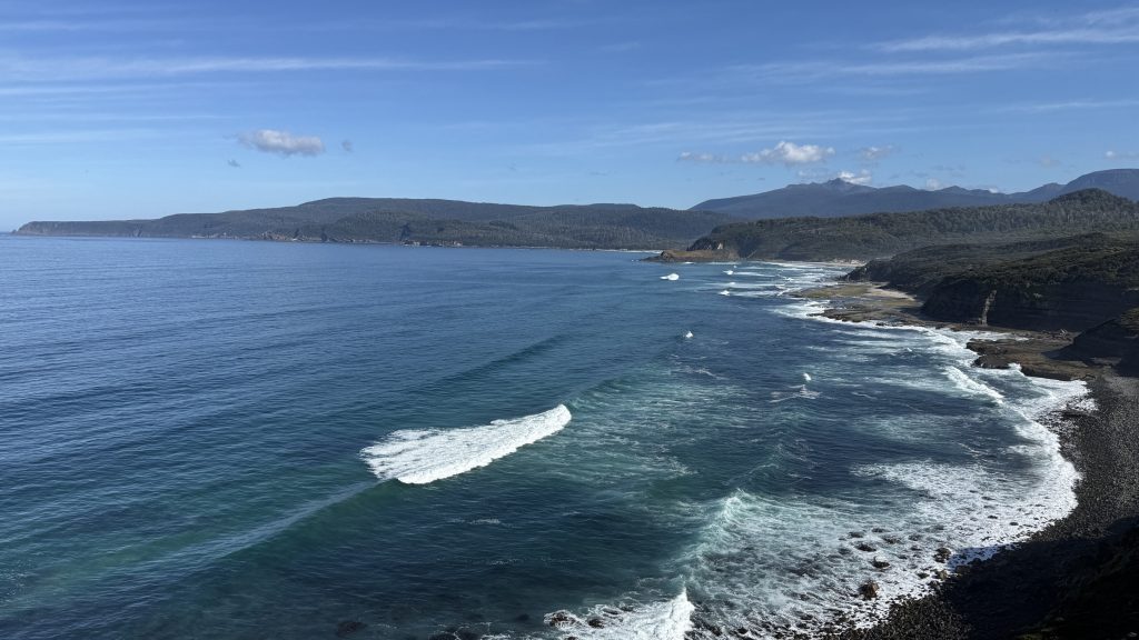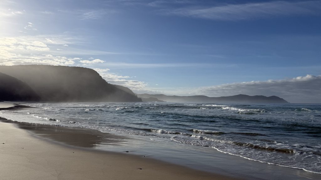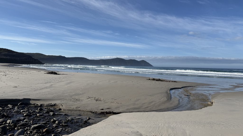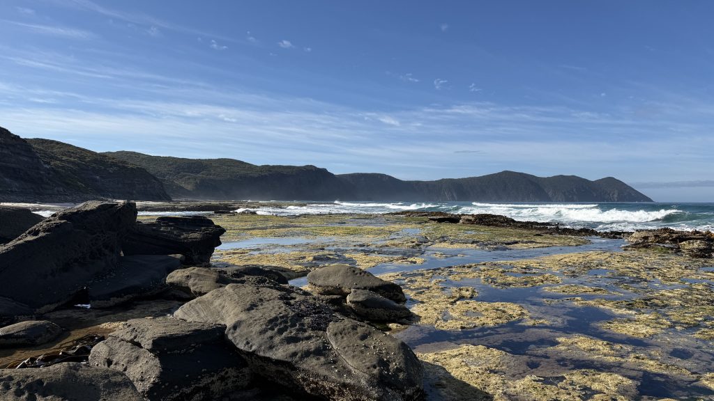 I sit and eat my lunch and look out across the vast blue ocean towards Antarctica. Small boats sporadically make their slow way around the cape. The waves smash and churn themselves to foam on the rocks below. The sun is warm on my back, the breeze is gentle, and everything is quiet and slow. I’m grateful to myself for pushing on yesterday so I could have such beautiful weather for this bit today. I’ll have to start back soon, but for now I want to savour this.