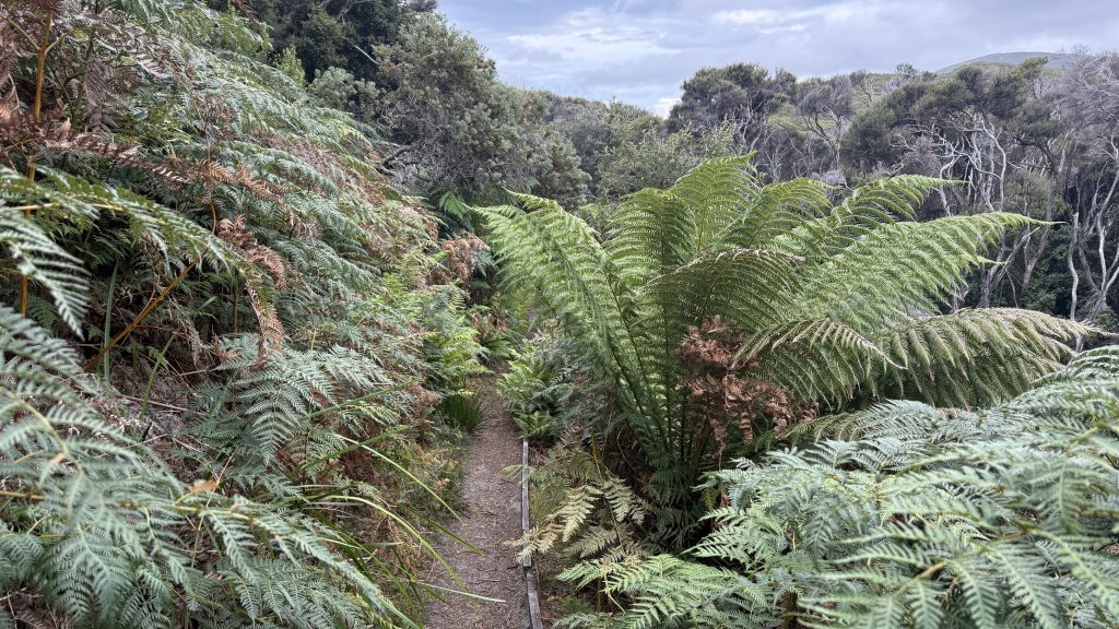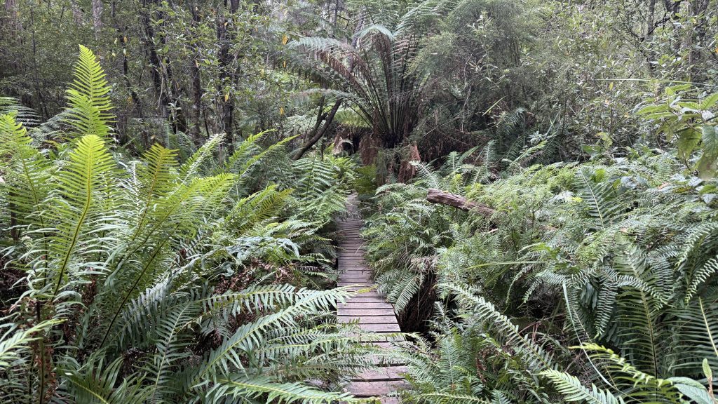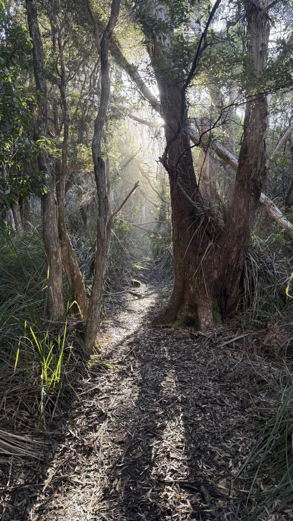The track passes through tea tree; open eucalypt; raised boardwalk amongst bracken and tree ferns. I pass an old couple looking at a map and say hello. He says it looks like halfway to go. She says less.