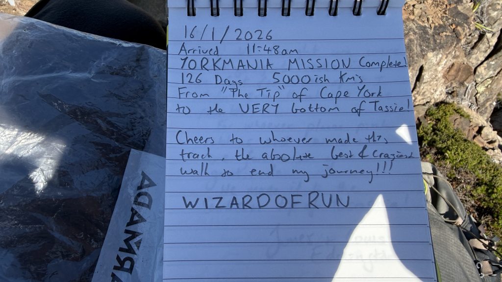 Finally, after what feels like hours struggling through scrub and fighting to stay vigilant to the track, I emerge on the southern tip. It’s a hell of a feeling. Cockle Creek might be the end, but this is the destination. I read the log book that’s sealed in a plastic ammo tin. Somebody back in January reached here after apparently running from Cape York! Ridiculous the things some people will do!