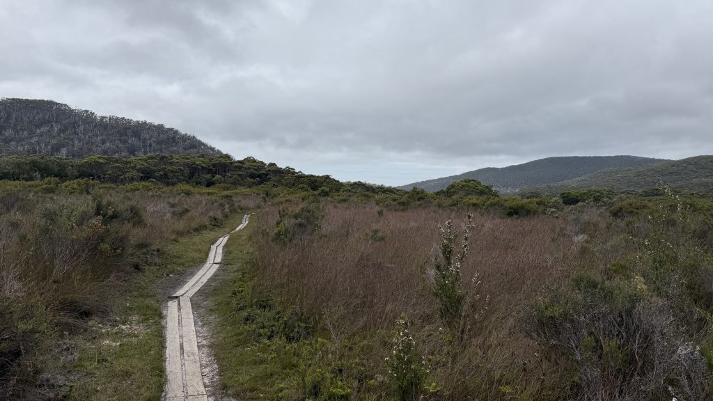 By the time I get back to the campsite, clouds are moving in. The creek is a little brackish, but I have a little drink anyway. The tide is coming in, so I’ll have to take the high route back to the South Coast Track.
