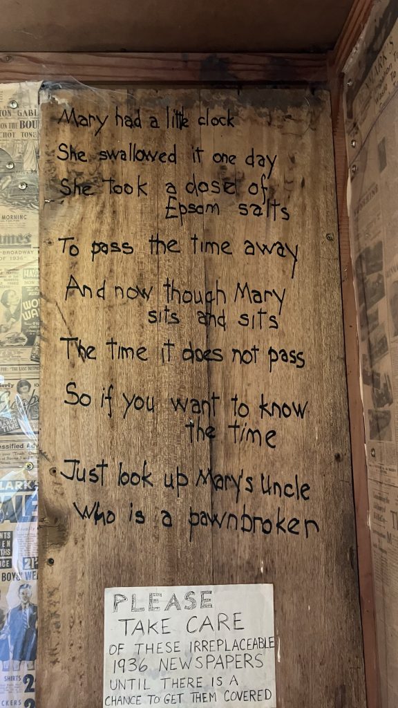 The walk down to the weather station started out okay but quickly became a ridiculous scrub bash. By the time we made it out we were happy just to lie on the grass for a bit. Another 2km and we met back up with Scott and Robyn at O’Keefes hut. This is the one with lots of newspapers from the late 1930s plastered on the walls.