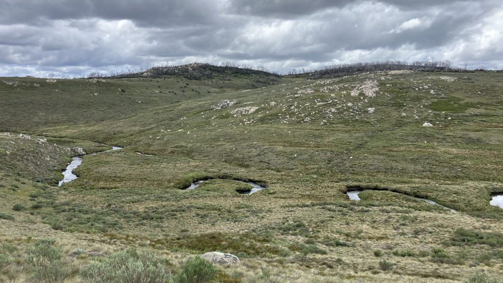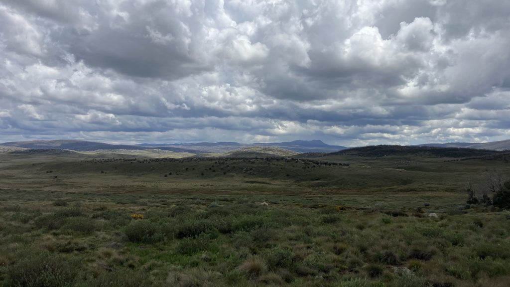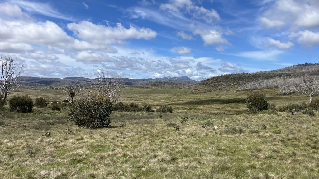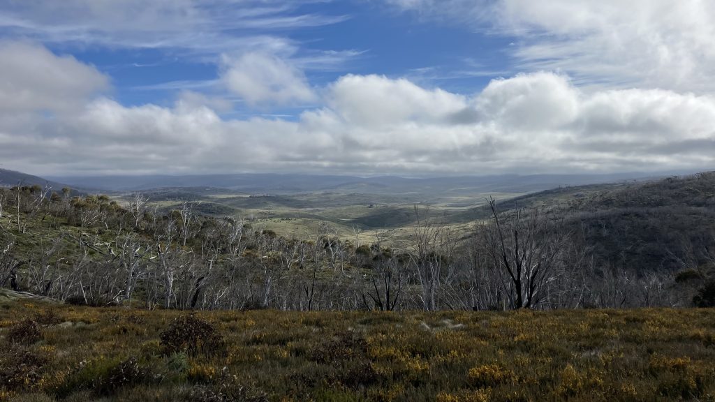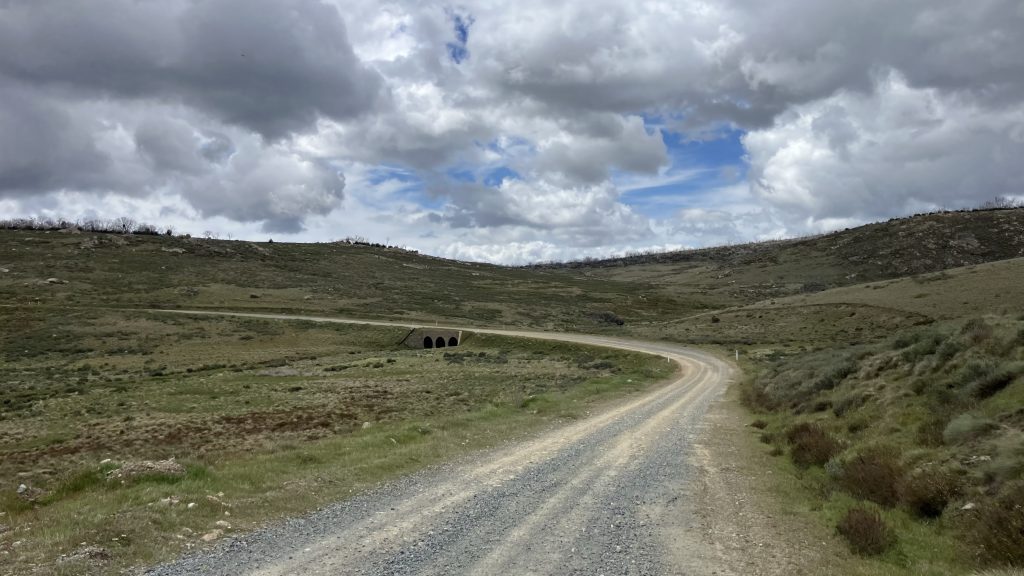 Faced with a choice between 3.5km off-track or 7km of road, we chose the road. Happy Jack’s Road is a broad, gentle gravel road closed to public vehicles. It crosses creeks with huge culverts and spans gullies atop large earth works. Our best guess is that it was built for the Snowy Hydro scheme. We flew along it at breakneck pace.