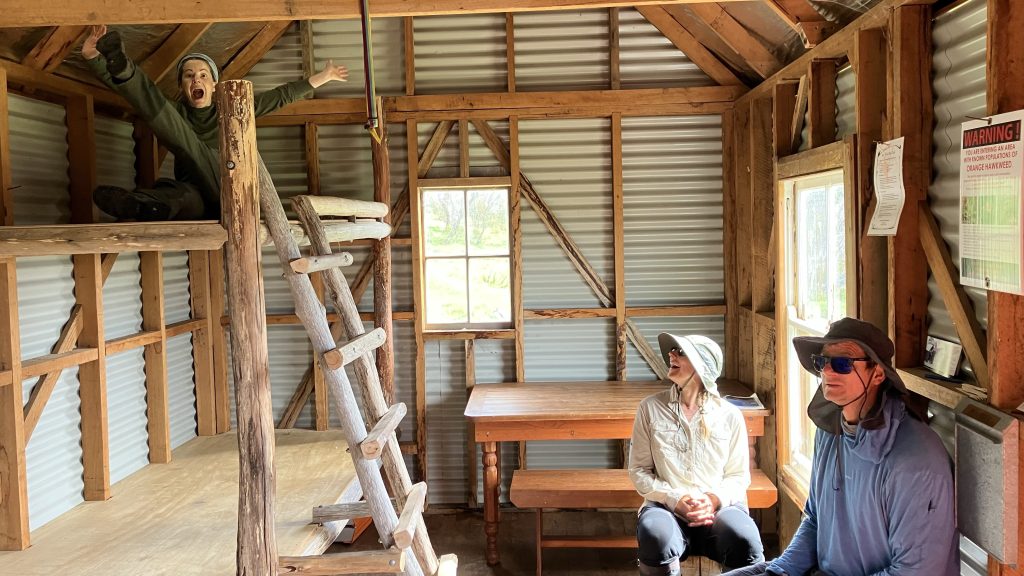 We got a cozy fire going in the fireplace and spent a pleasant evening cracking jokes, reflecting on the walk so far, and sharing stories. Even Inga, who likes huts but doesn’t like to be inside them, was lured in.